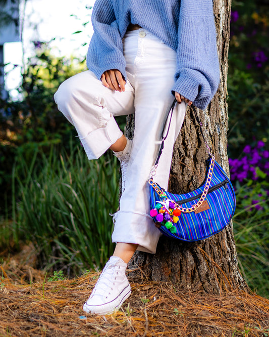 Inspirada en la colorida bolsa de ixtle usada por los aztecas, hemos diseñado cada uno de nuestros productos como una manifestación de nuestra mexicanidad. Elaborada artesanalmente con malla, porta nuestro distintivo llavero hecho con materiales típicos como el peltre de Tonalá, Jalisco y esferas de palma michoacanas.