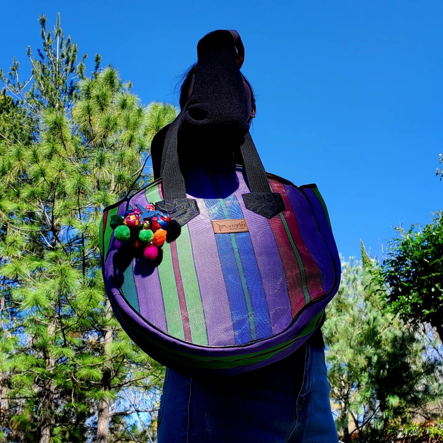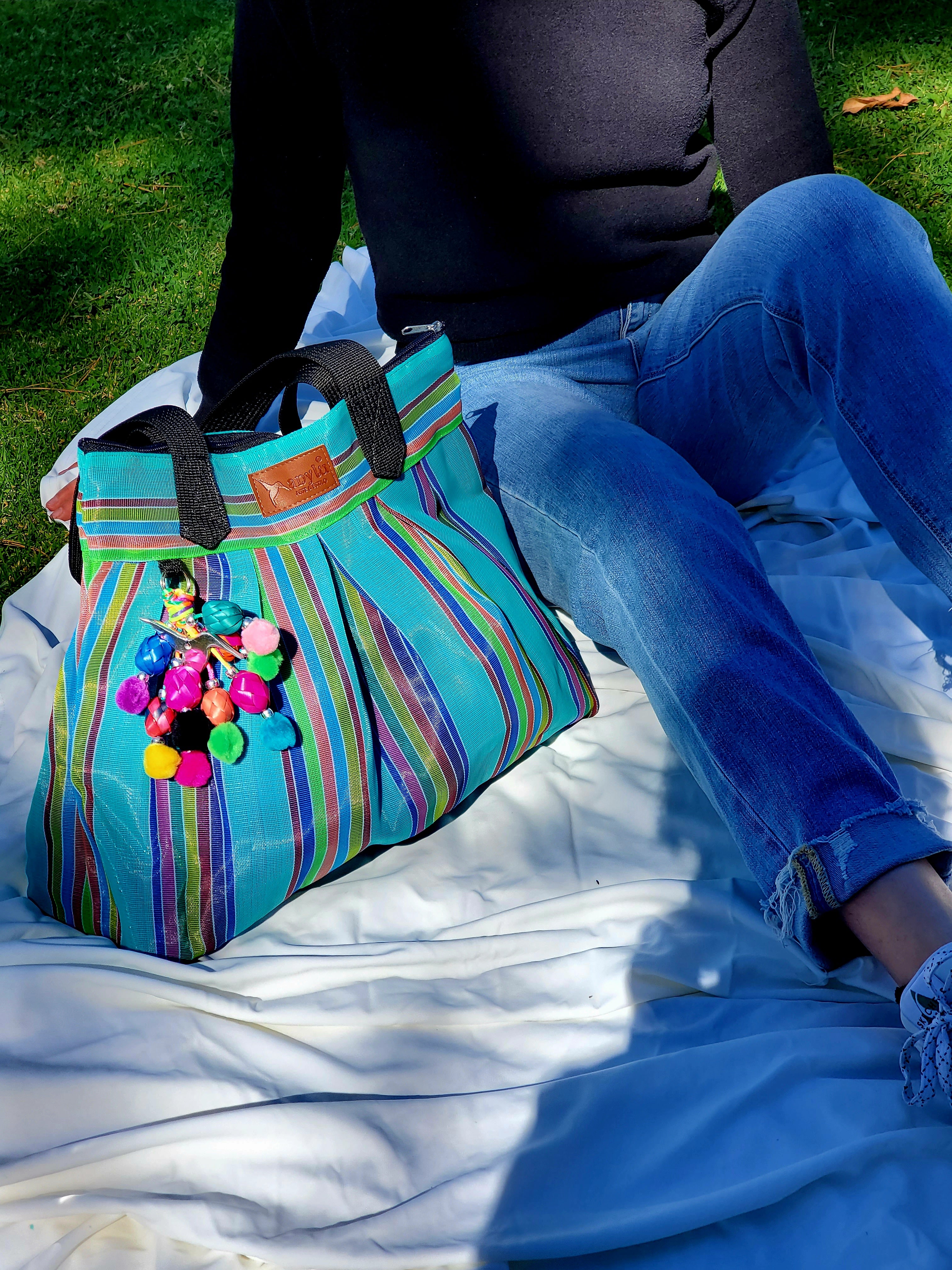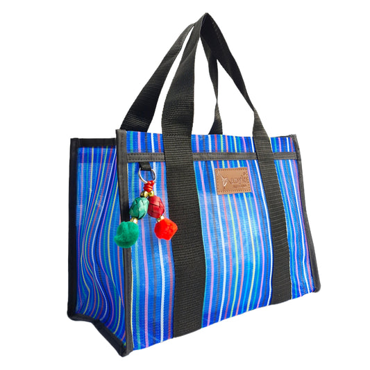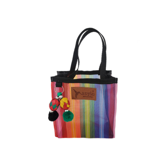 Inspirada en la colorida bolsa de ixtle usada por los aztecas, hemos diseñado cada uno de nuestros productos como una manifestación de nuestra mexicanidad. Elaborada artesanalmente con malla, porta nuestro distintivo llavero hecho con materiales típicos como el peltre de Tonalá, Jalisco y esferas de palma michoacanas.