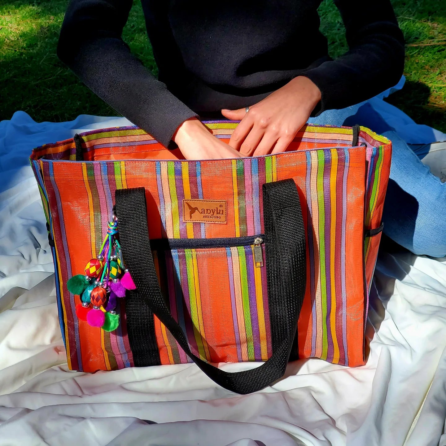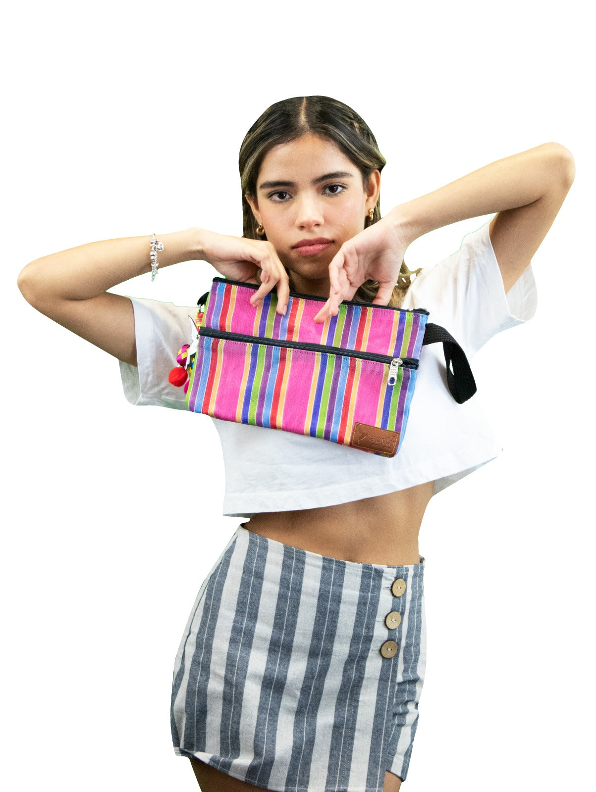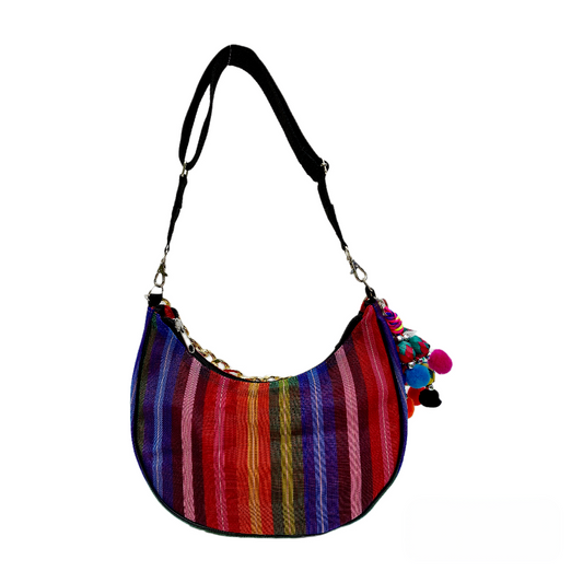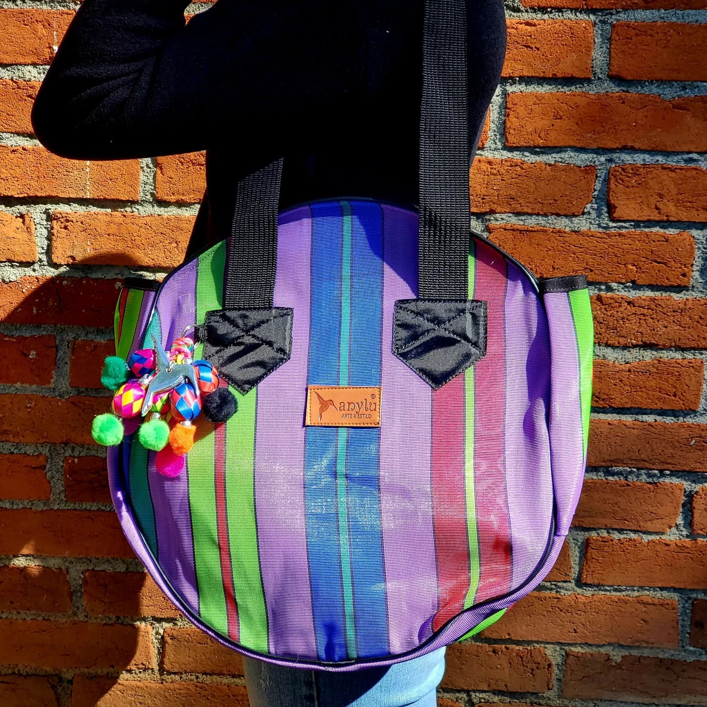 Inspirada en la colorida bolsa de ixtle usada por los aztecas, hemos diseñado cada uno de nuestros productos como una manifestación de nuestra mexicanidad. Elaborada artesanalmente con malla, porta nuestro distintivo llavero hecho con materiales típicos como el peltre de Tonalá, Jalisco y esferas de palma michoacanas.