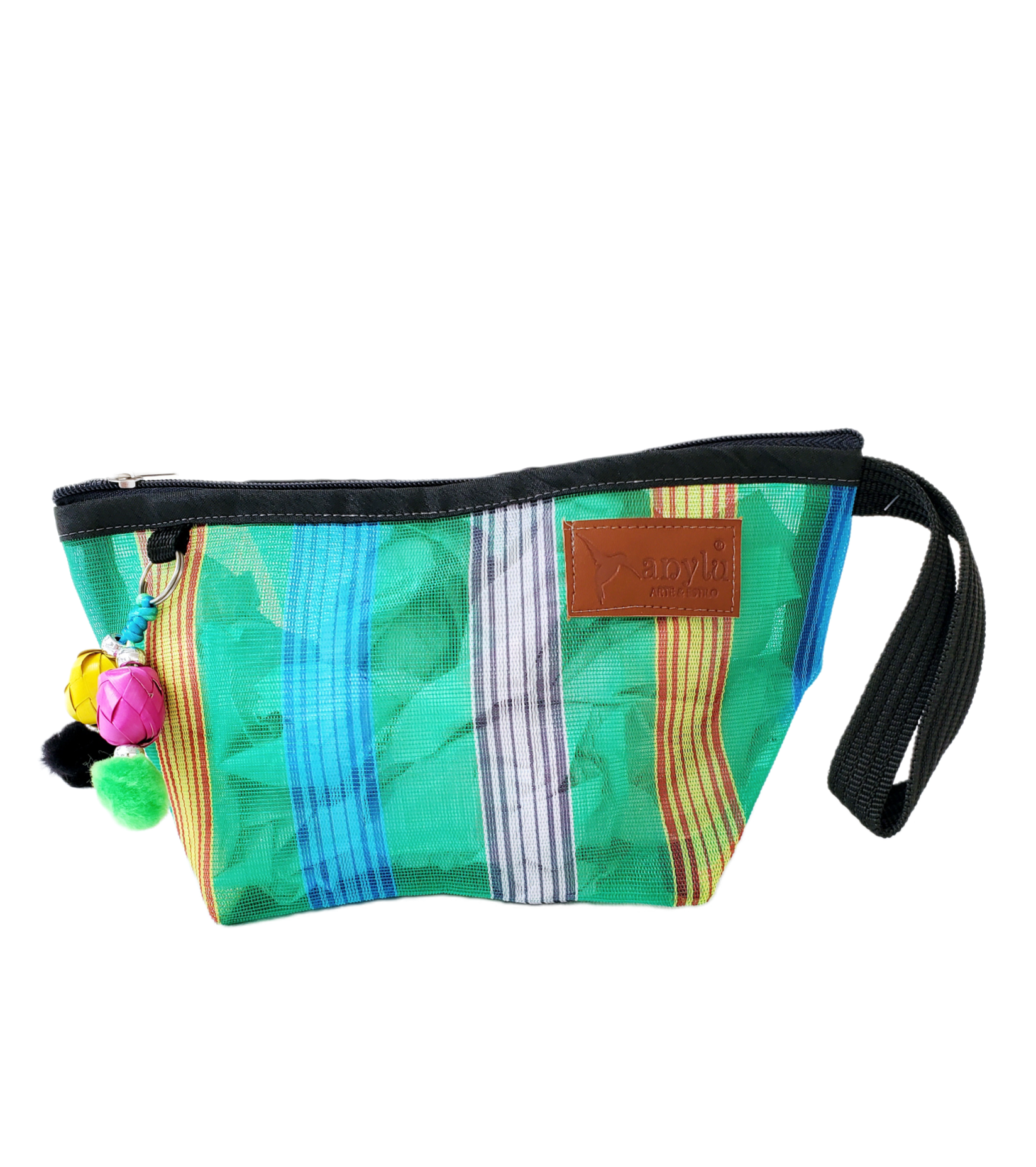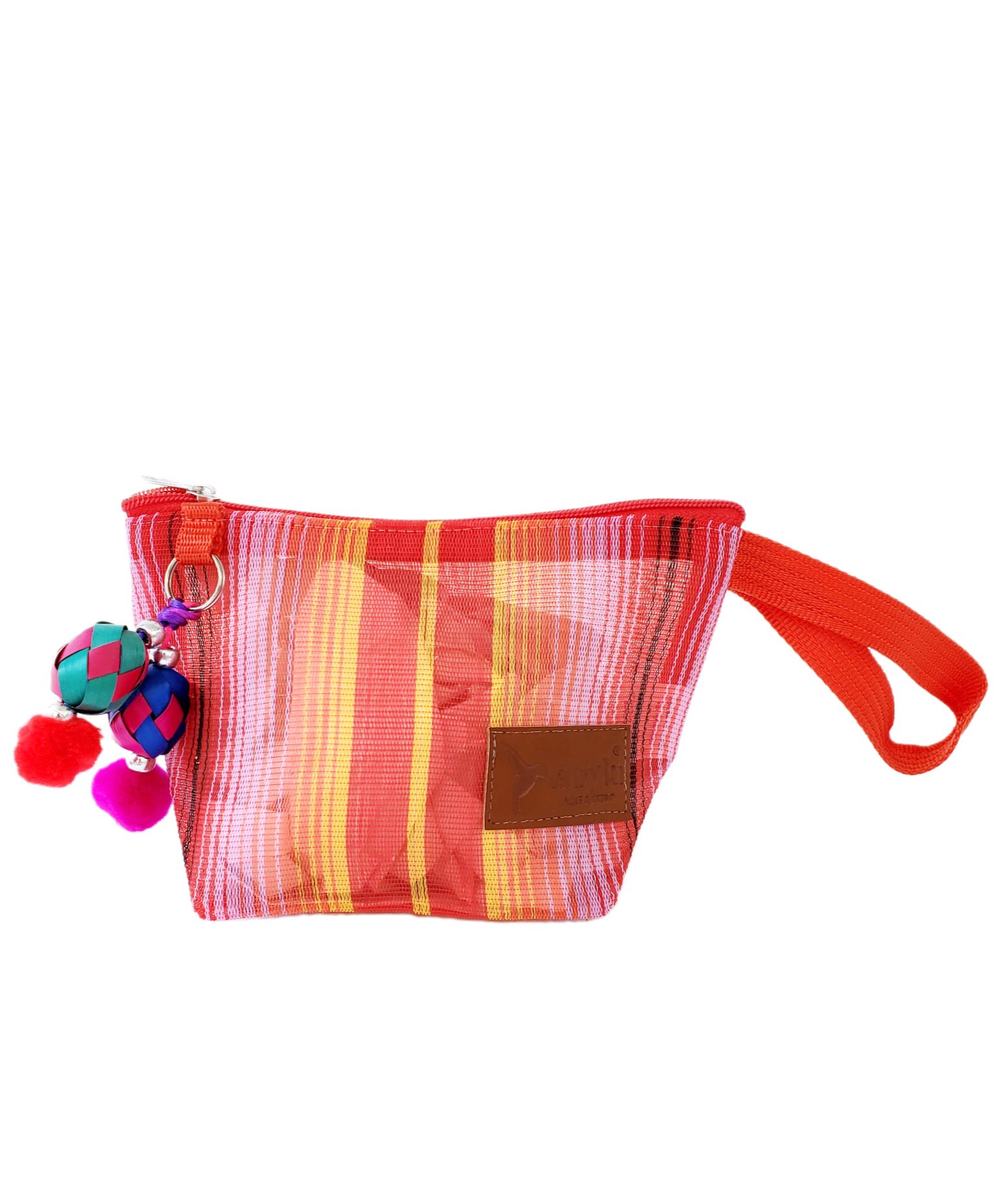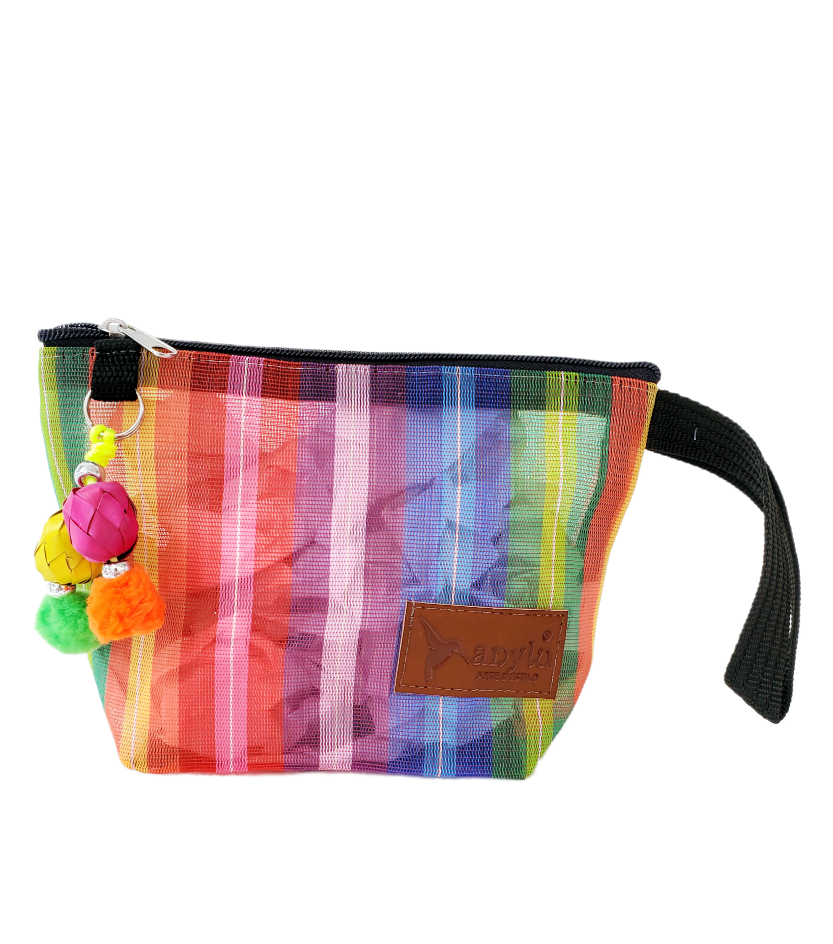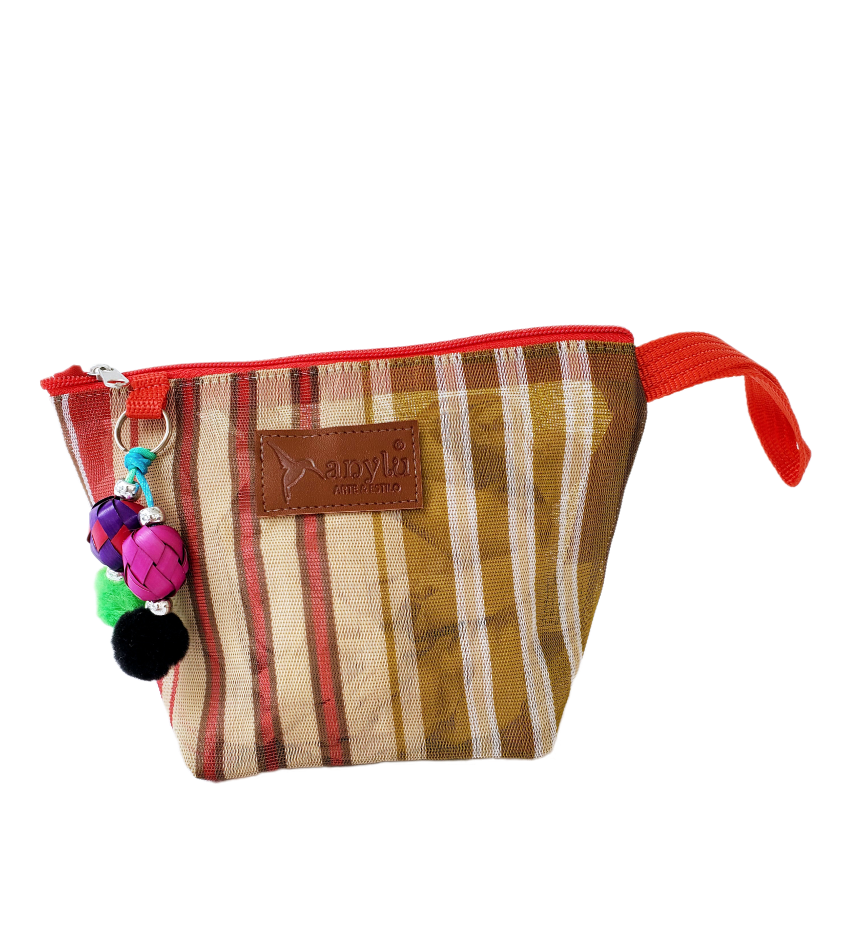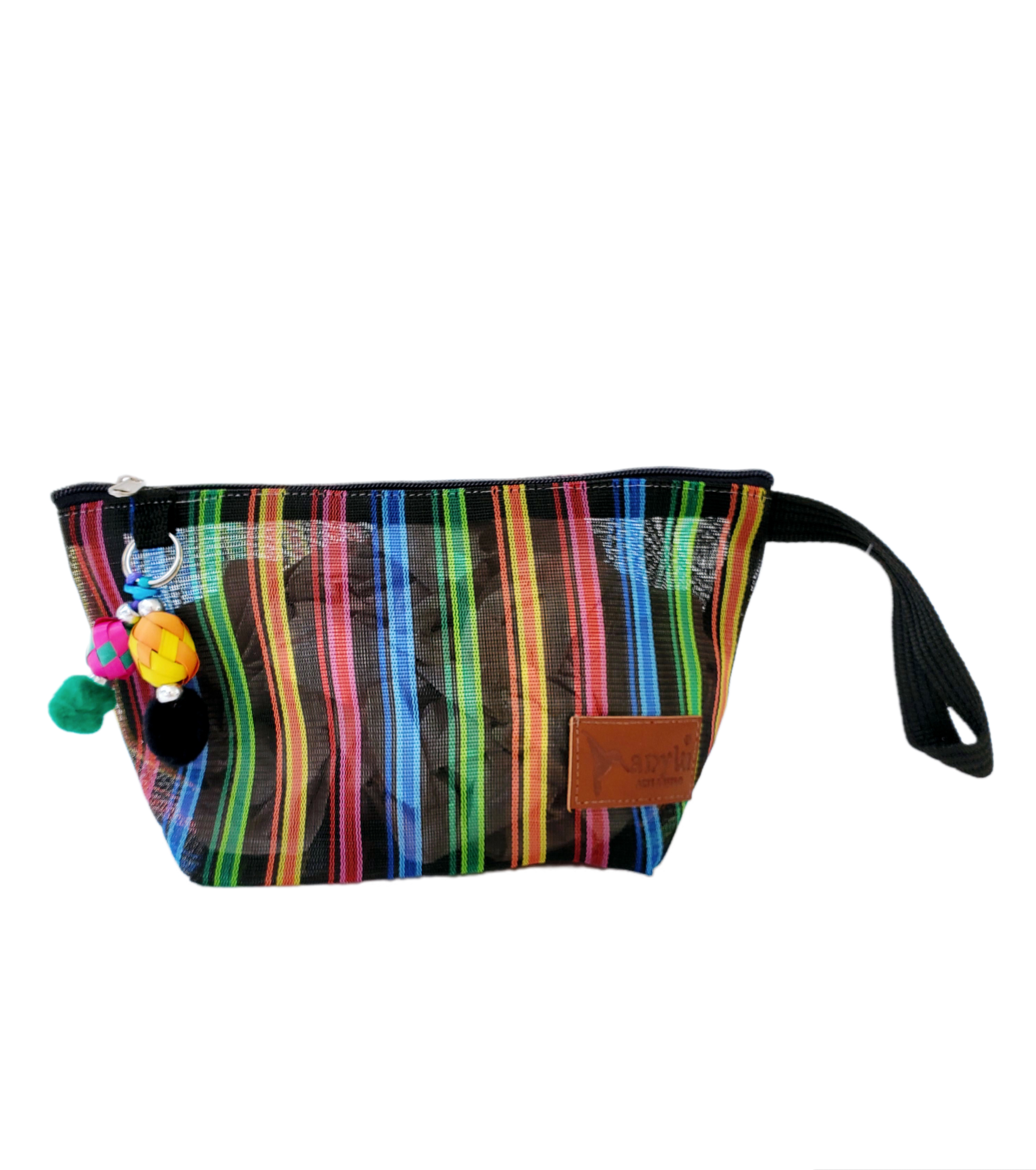 Inspirada en la colorida bolsa de ixtle usada por los aztecas, hemos diseñado cada uno de nuestros productos como una manifestación de nuestra mexicanidad. Elaborada artesanalmente con malla, porta nuestro distintivo llavero hecho con materiales típicos como el peltre de Tonalá, Jalisco y esferas de palma michoacanas.