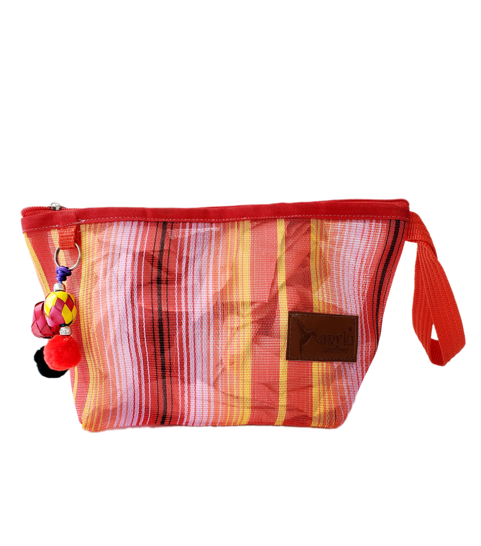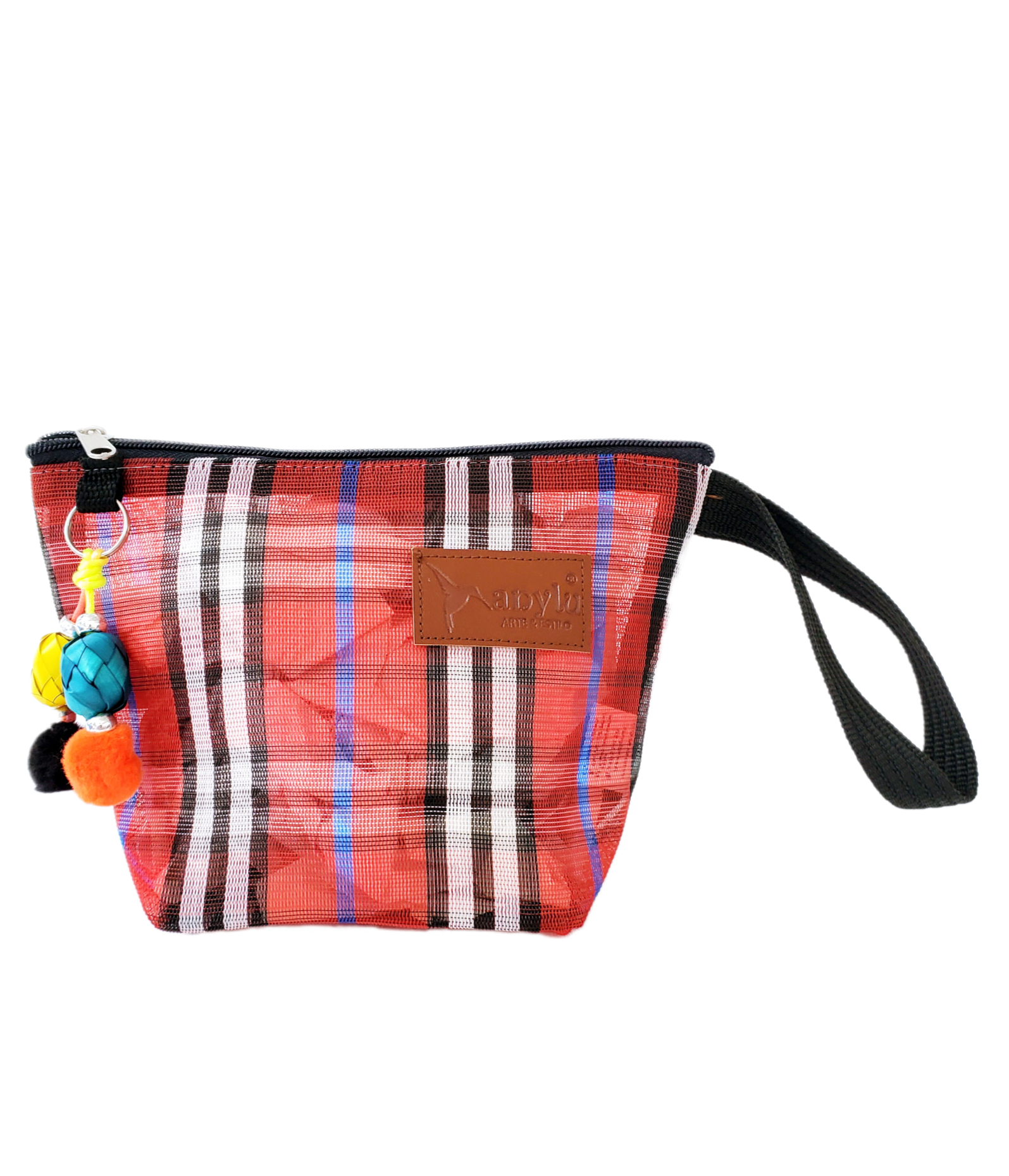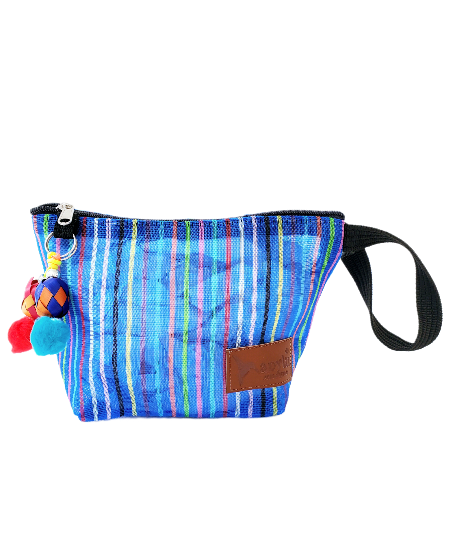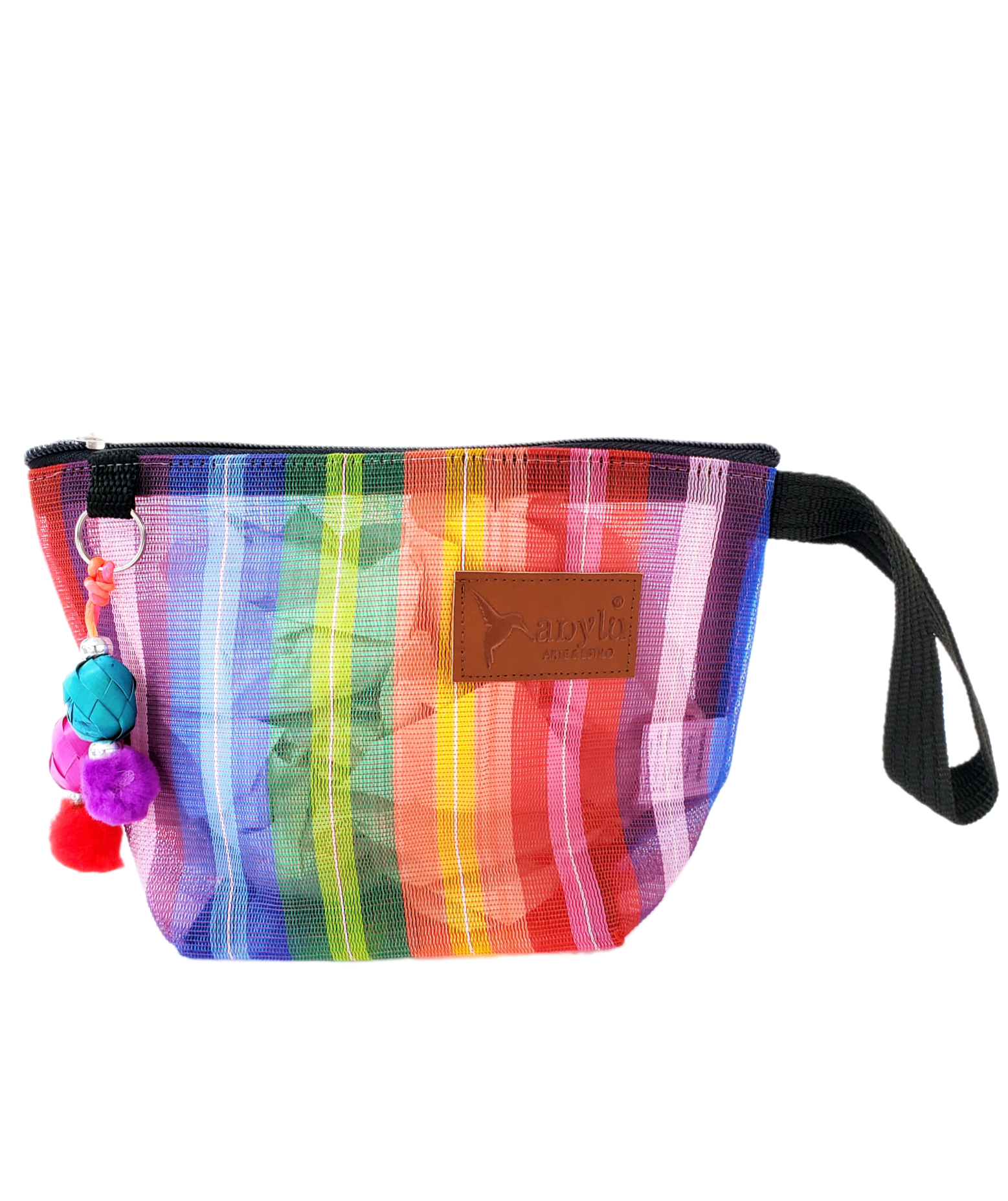 Inspirada en la colorida bolsa de ixtle usada por los aztecas, hemos diseñado cada uno de nuestros productos como una manifestación de nuestra mexicanidad. Elaborada artesanalmente con malla, porta nuestro distintivo llavero hecho con materiales típicos como el peltre de Tonalá, Jalisco y esferas de palma michoacanas.