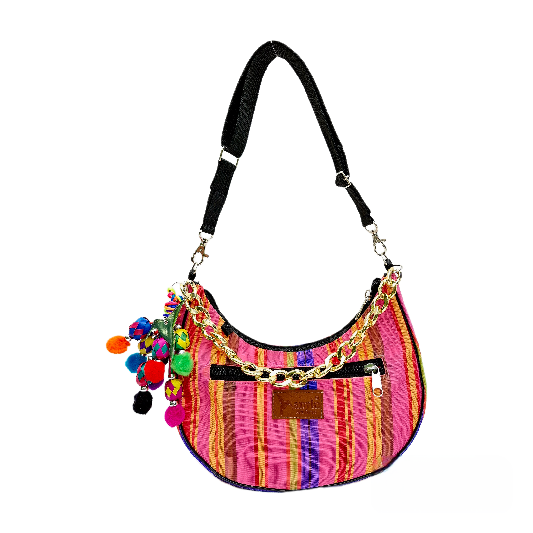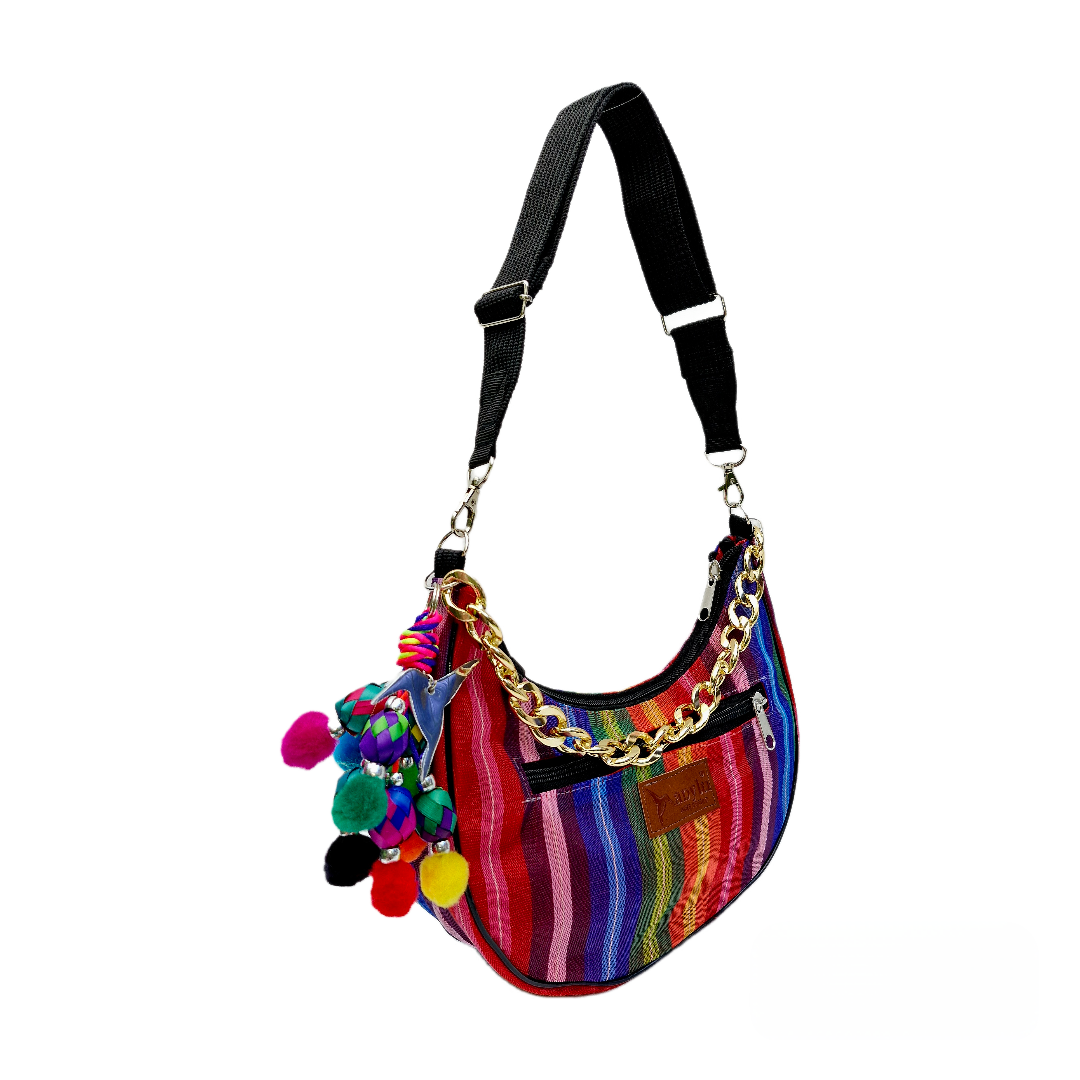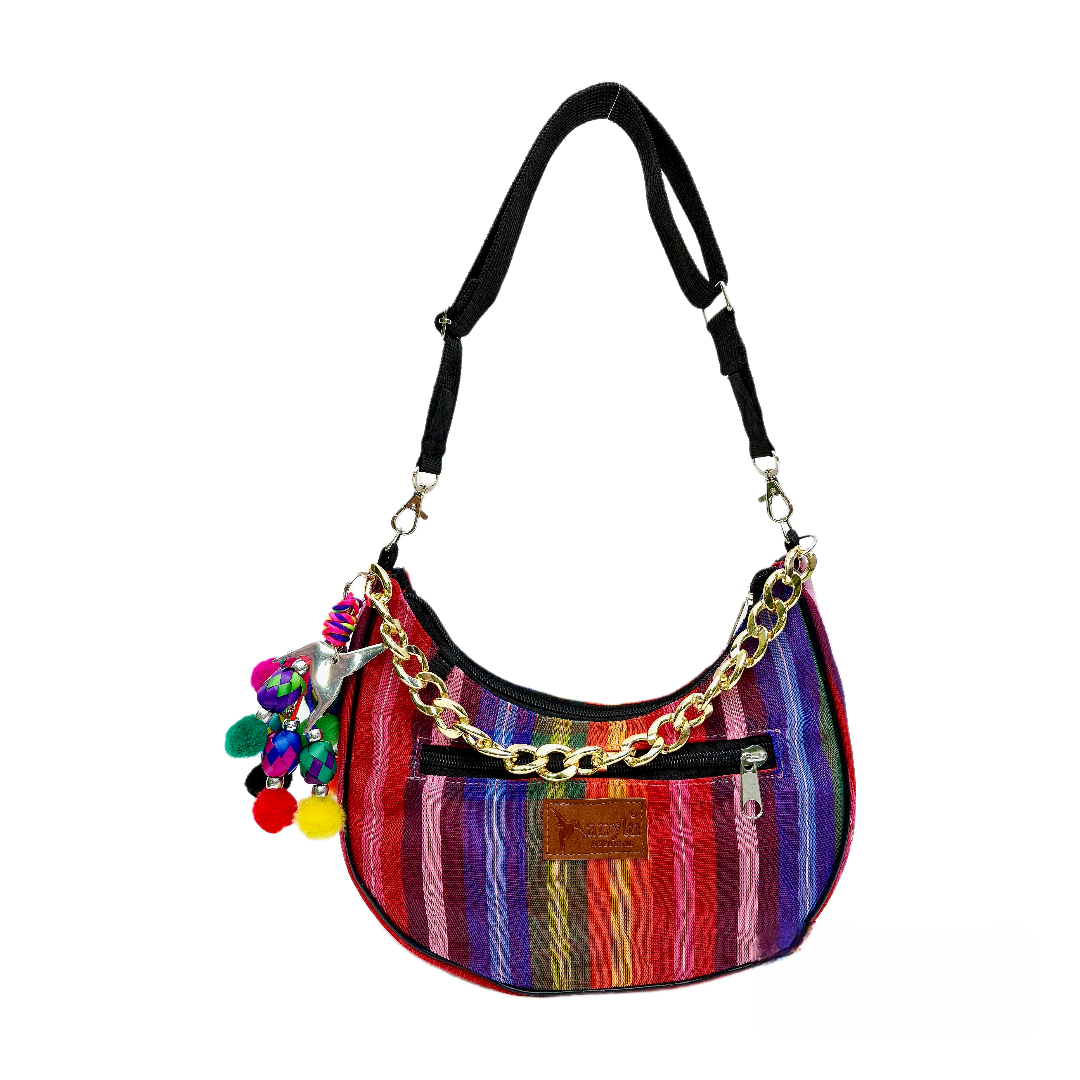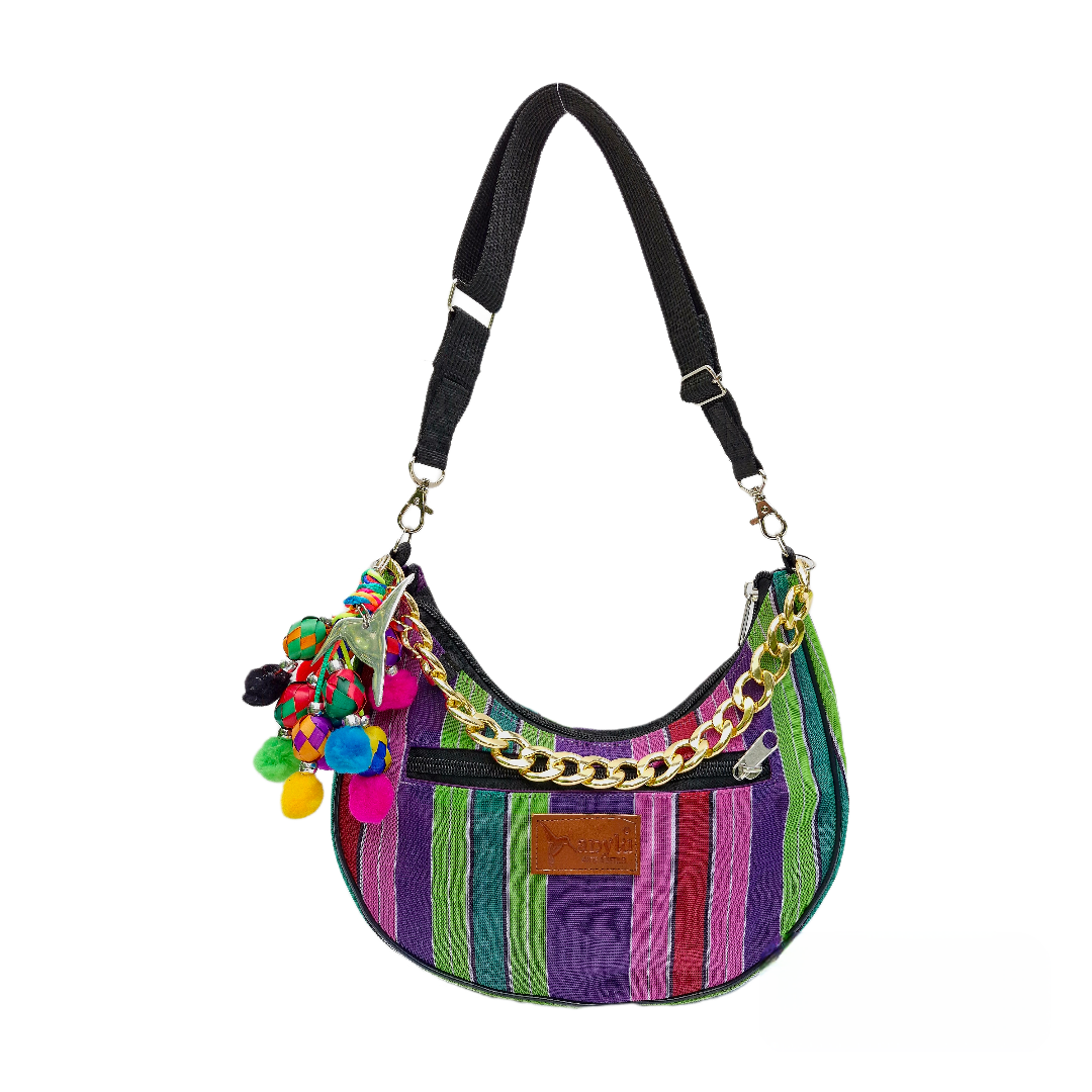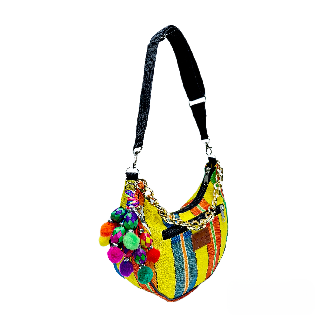 Descubre el bolso Luna, una pieza única que combina elegancia y estilo en una forma de media luna innovadora. Con unas dimensiones perfectas de 28 cm de ancho y 22 cm de alto, este bolso ofrece un diseño sofisticado y práctico. Su cadena dorada le aporta un toque de glamour, mientras que el asa larga ajustable garantiza comodidad y versatilidad en cada uso. Además, el encantador llavero con esferas de palma de Tzintzuntzan añade un detalle artesanal y distintivo, que celebra la tradición y la belleza en cada pequeño detalle. Luna es la elección ideal para quien busca un accesorio que resalte por su diseño elegante y su autenticidad cultural.