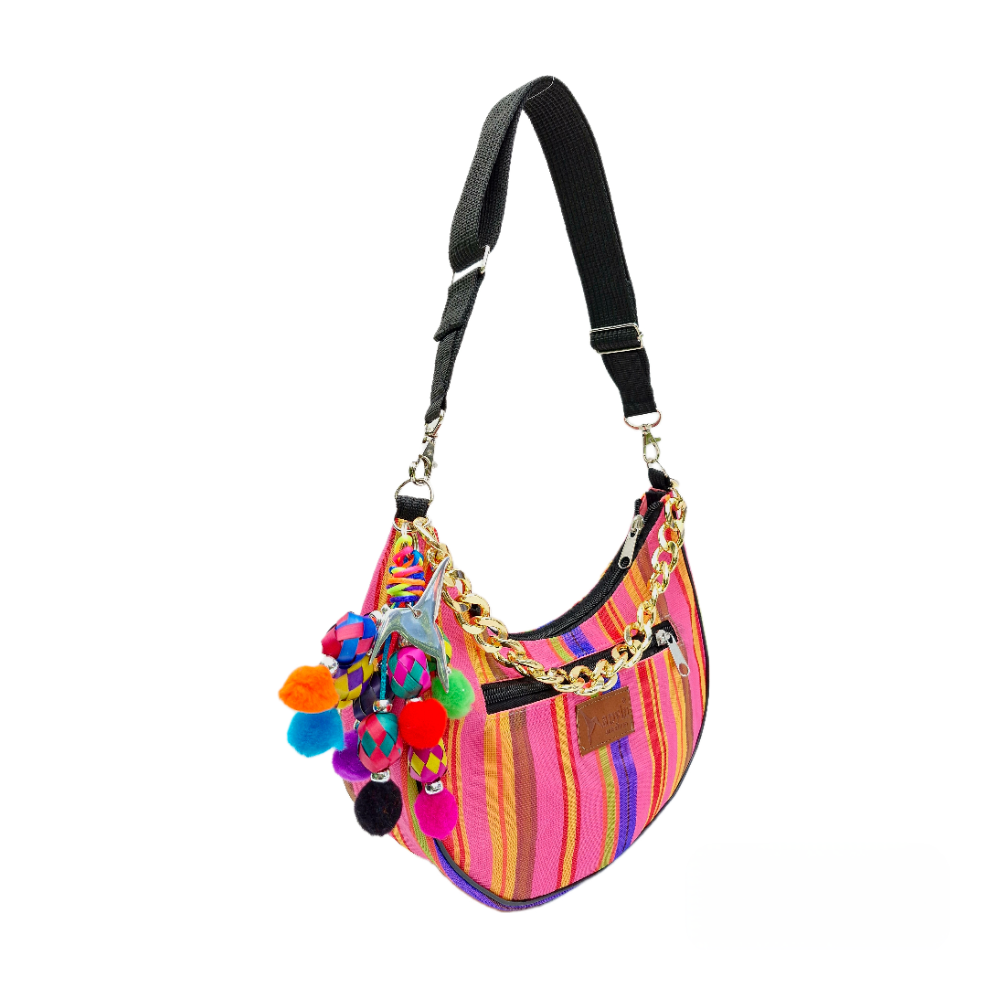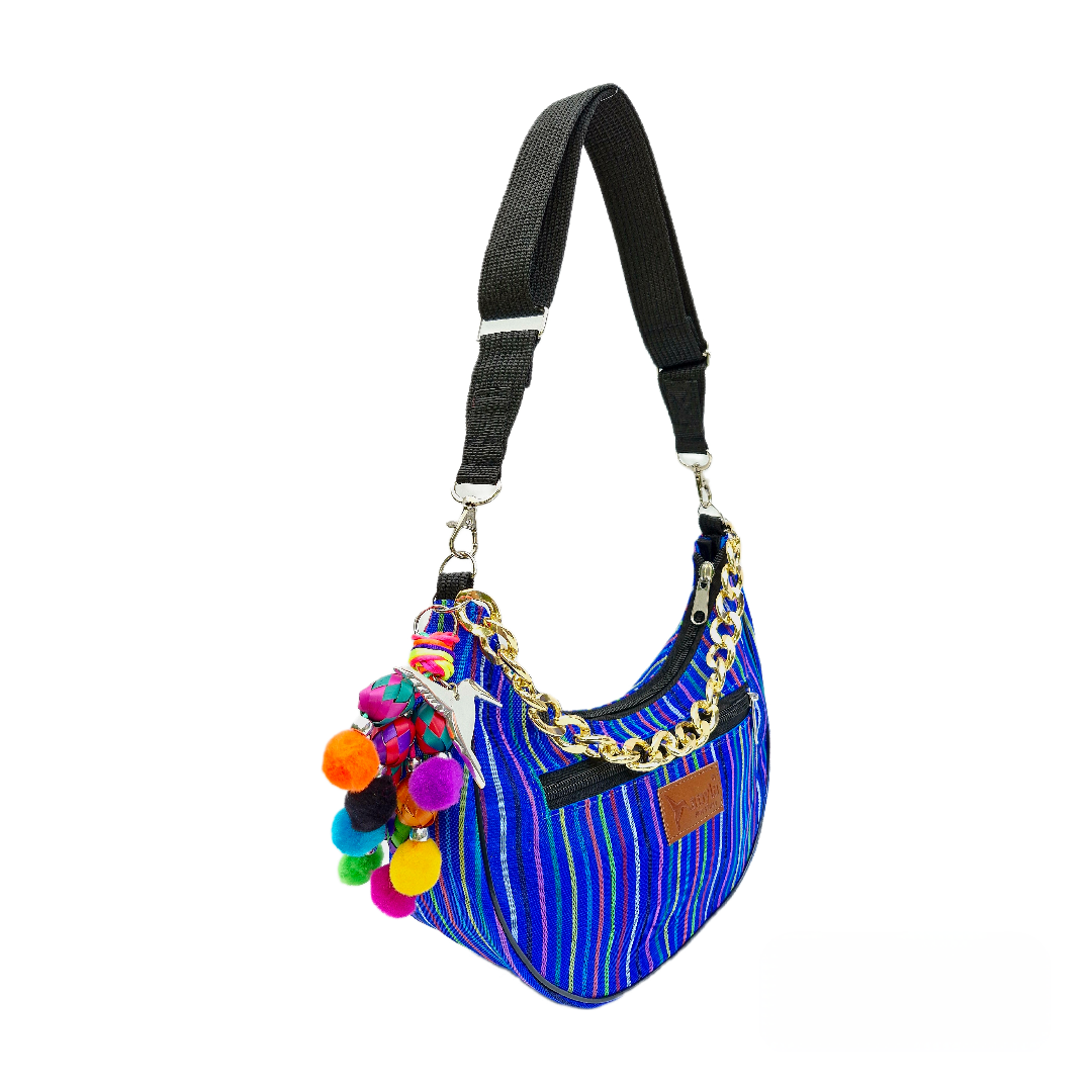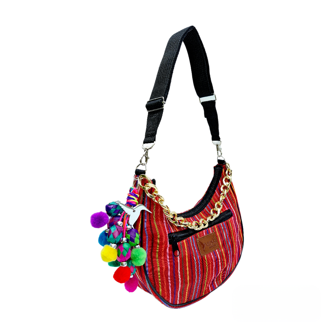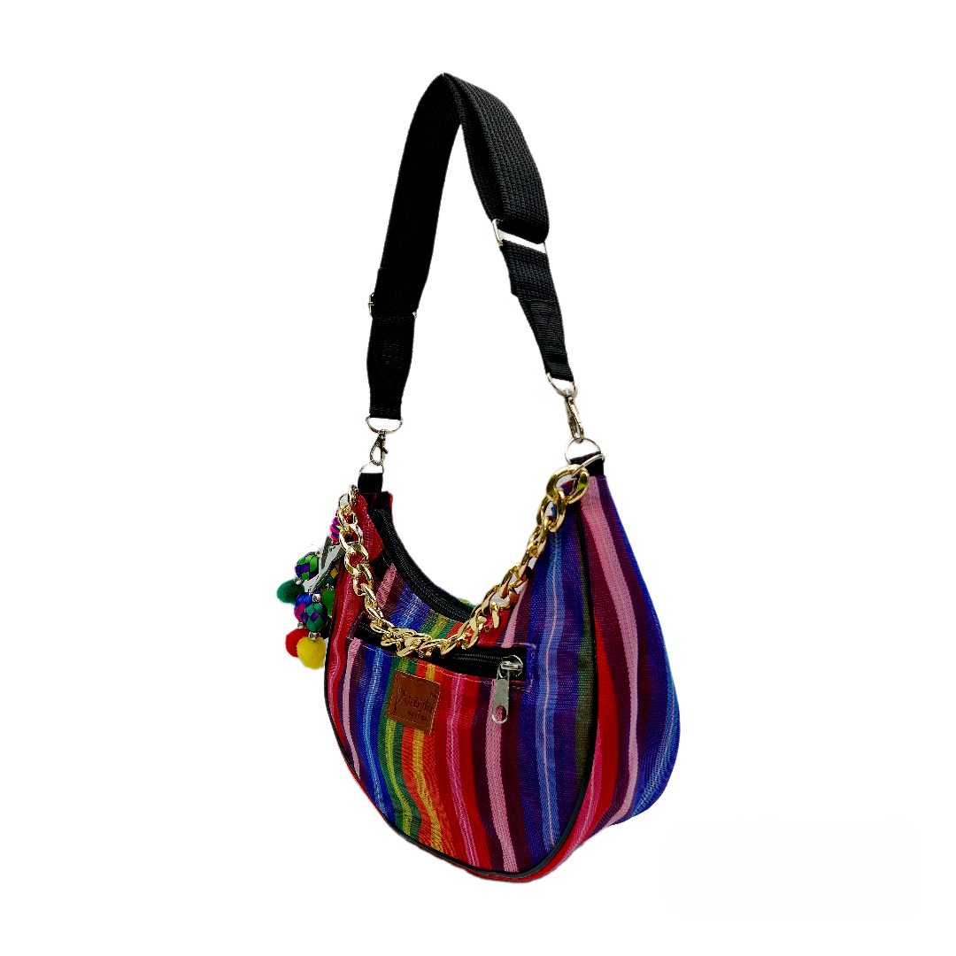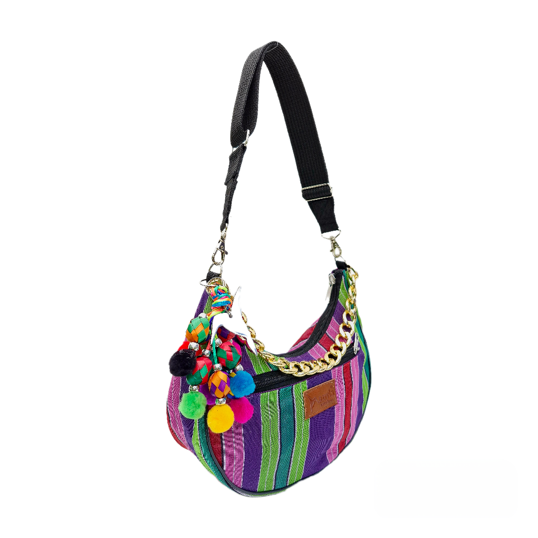 Descubre el bolso Luna, una pieza única que combina elegancia y estilo en una forma de media luna innovadora. Con unas dimensiones perfectas de 28 cm de ancho y 22 cm de alto, este bolso ofrece un diseño sofisticado y práctico. Su cadena dorada le aporta un toque de glamour, mientras que el asa larga ajustable garantiza comodidad y versatilidad en cada uso. Además, el encantador llavero con esferas de palma de Tzintzuntzan añade un detalle artesanal y distintivo, que celebra la tradición y la belleza en cada pequeño detalle. Luna es la elección ideal para quien busca un accesorio que resalte por su diseño elegante y su autenticidad cultural.