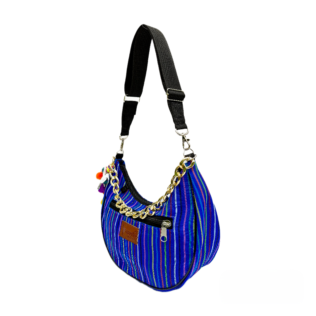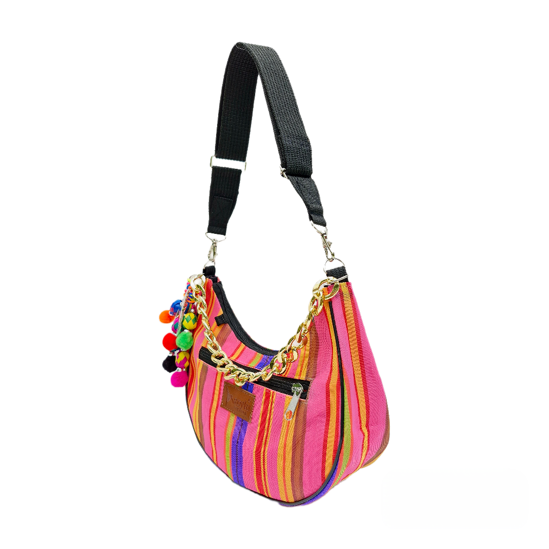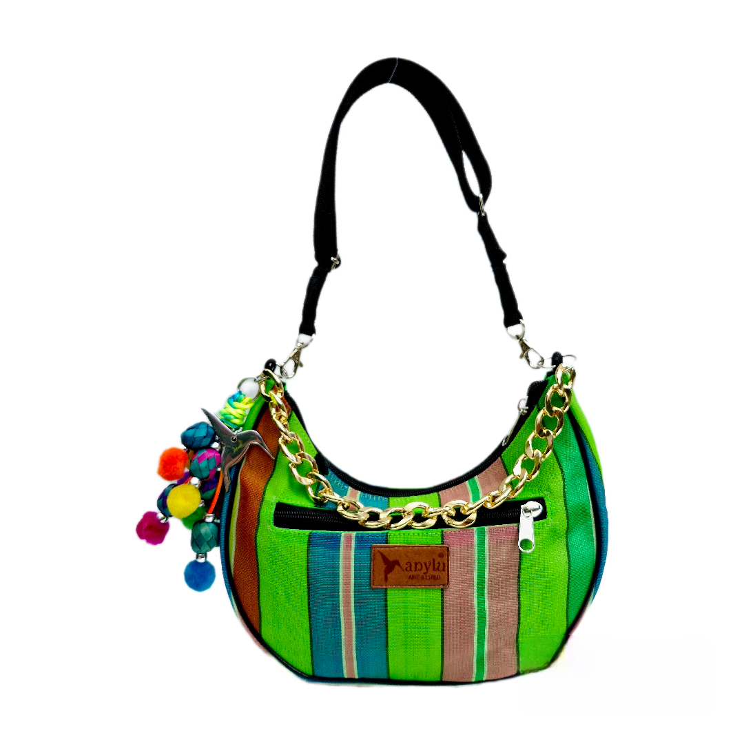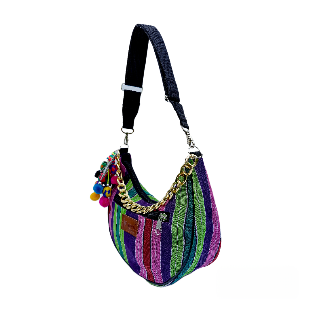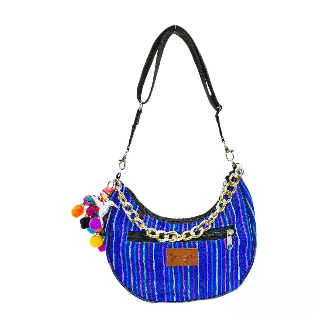 Descubre el bolso Luna, una pieza única que combina elegancia y estilo en una forma de media luna innovadora. Con unas dimensiones perfectas de 28 cm de ancho y 22 cm de alto, este bolso ofrece un diseño sofisticado y práctico. Su cadena dorada le aporta un toque de glamour, mientras que el asa larga ajustable garantiza comodidad y versatilidad en cada uso. Además, el encantador llavero con esferas de palma de Tzintzuntzan añade un detalle artesanal y distintivo, que celebra la tradición y la belleza en cada pequeño detalle. Luna es la elección ideal para quien busca un accesorio que resalte por su diseño elegante y su autenticidad cultural.