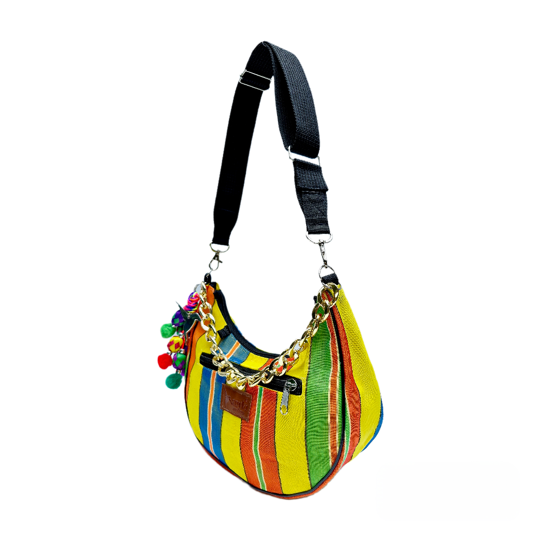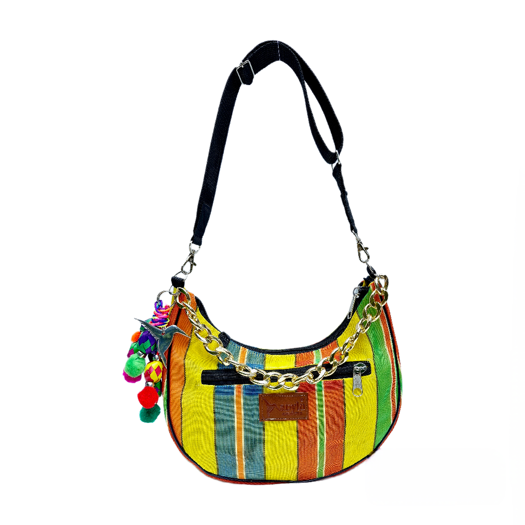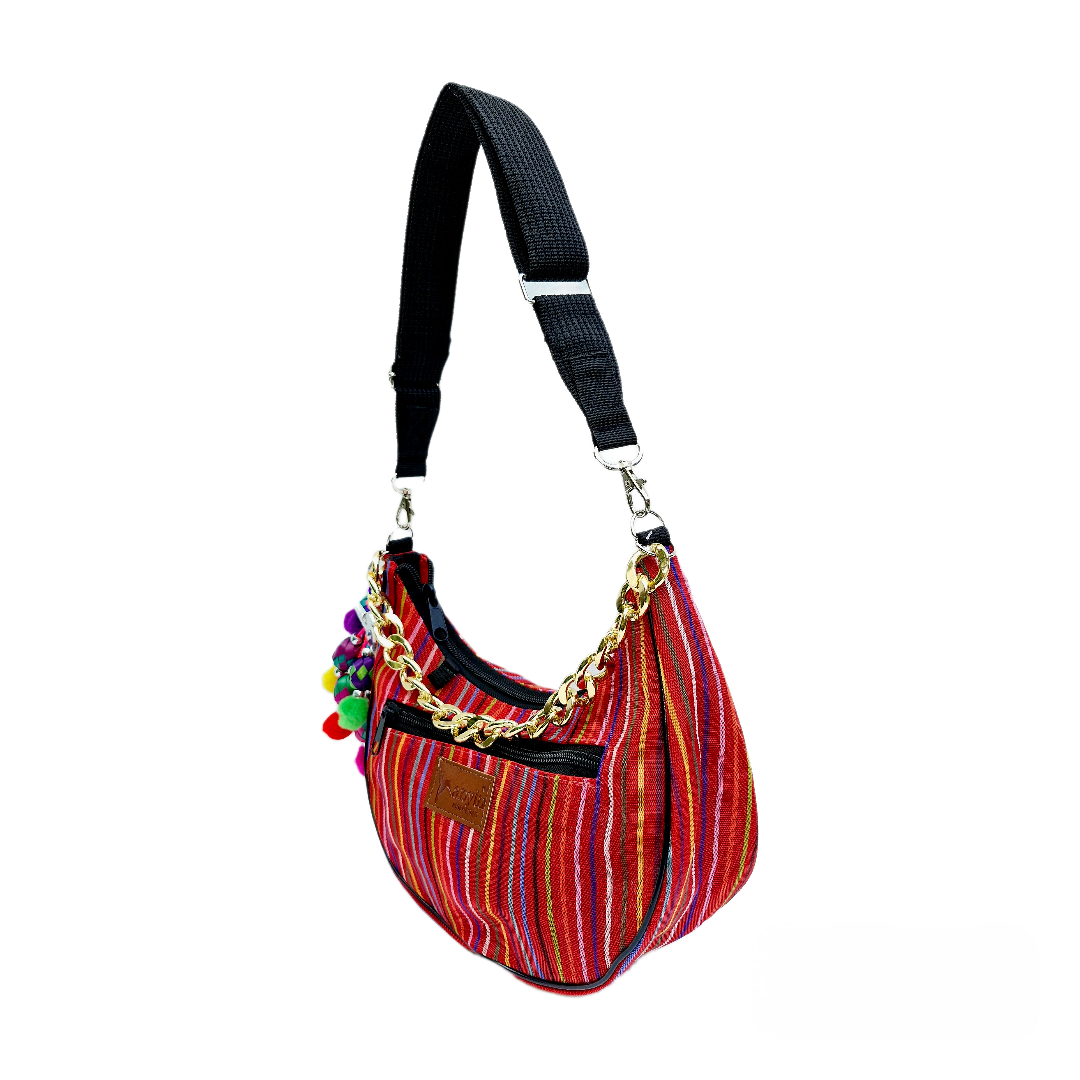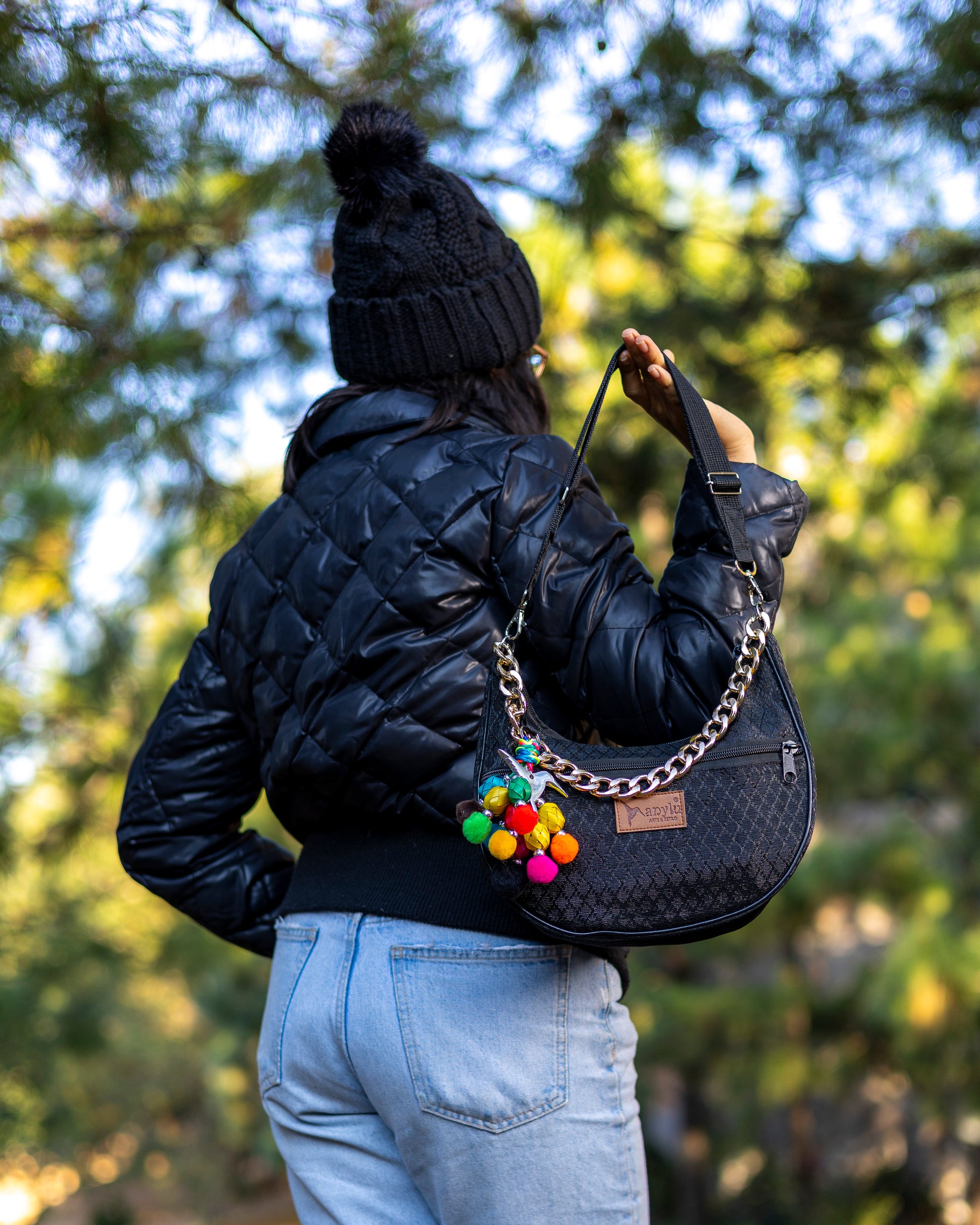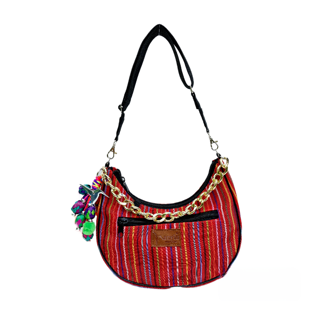 Descubre el bolso Luna, una pieza única que combina elegancia y estilo en una forma de media luna innovadora. Con unas dimensiones perfectas de 28 cm de ancho y 22 cm de alto, este bolso ofrece un diseño sofisticado y práctico. Su cadena dorada le aporta un toque de glamour, mientras que el asa larga ajustable garantiza comodidad y versatilidad en cada uso. Además, el encantador llavero con esferas de palma de Tzintzuntzan añade un detalle artesanal y distintivo, que celebra la tradición y la belleza en cada pequeño detalle. Luna es la elección ideal para quien busca un accesorio que resalte por su diseño elegante y su autenticidad cultural.