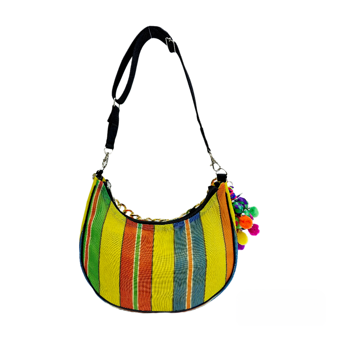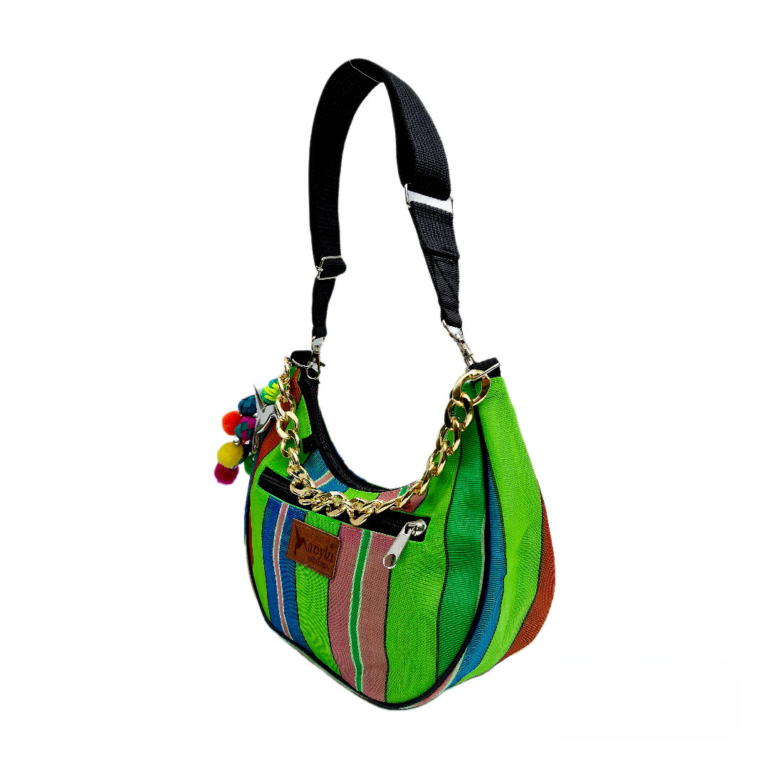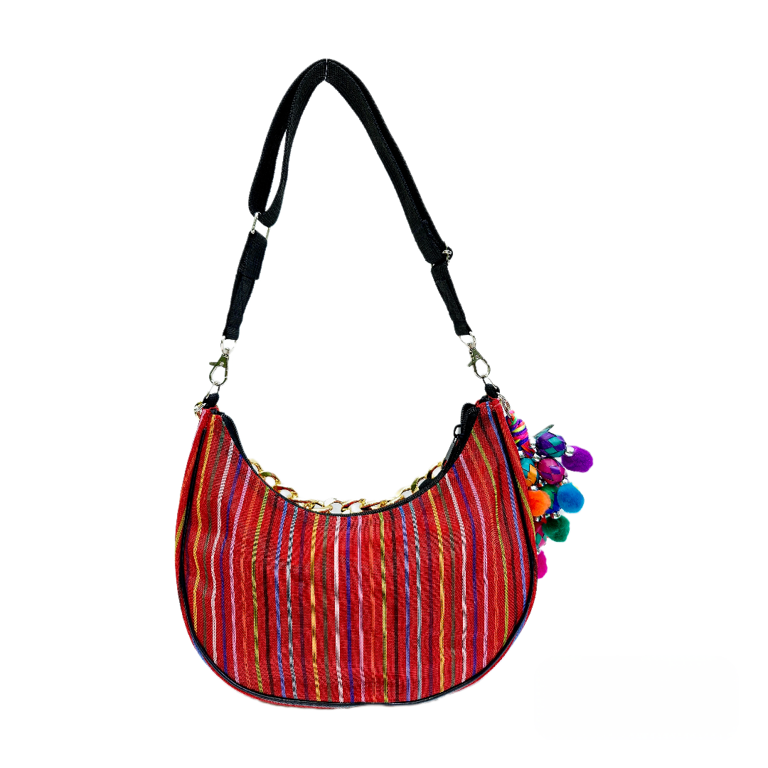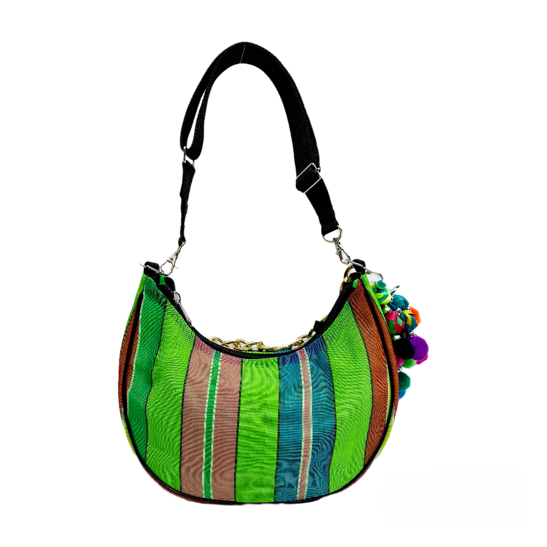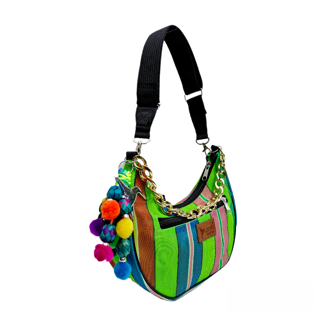 Descubre el bolso Luna, una pieza única que combina elegancia y estilo en una forma de media luna innovadora. Con unas dimensiones perfectas de 28 cm de ancho y 22 cm de alto, este bolso ofrece un diseño sofisticado y práctico. Su cadena dorada le aporta un toque de glamour, mientras que el asa larga ajustable garantiza comodidad y versatilidad en cada uso. Además, el encantador llavero con esferas de palma de Tzintzuntzan añade un detalle artesanal y distintivo, que celebra la tradición y la belleza en cada pequeño detalle. Luna es la elección ideal para quien busca un accesorio que resalte por su diseño elegante y su autenticidad cultural.
