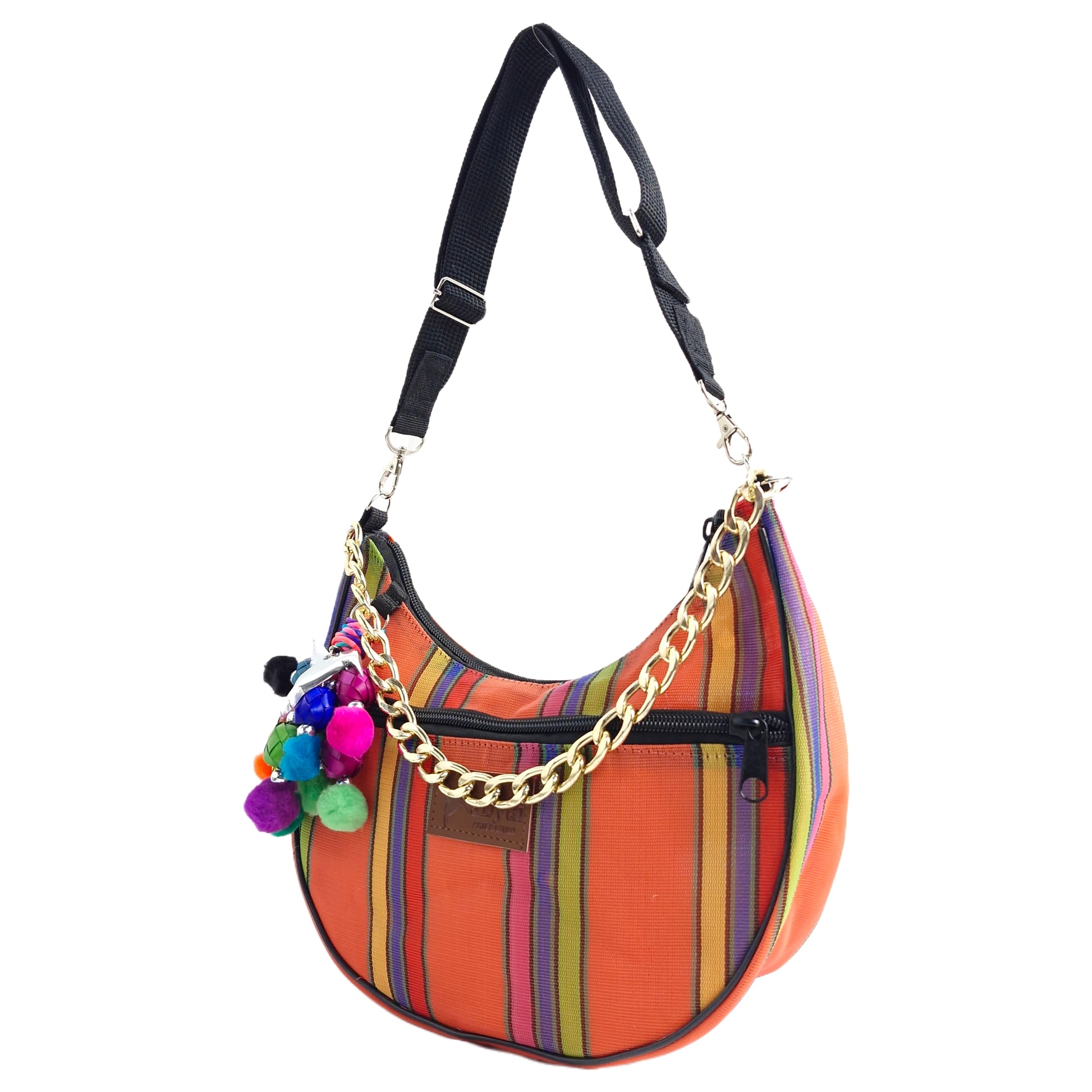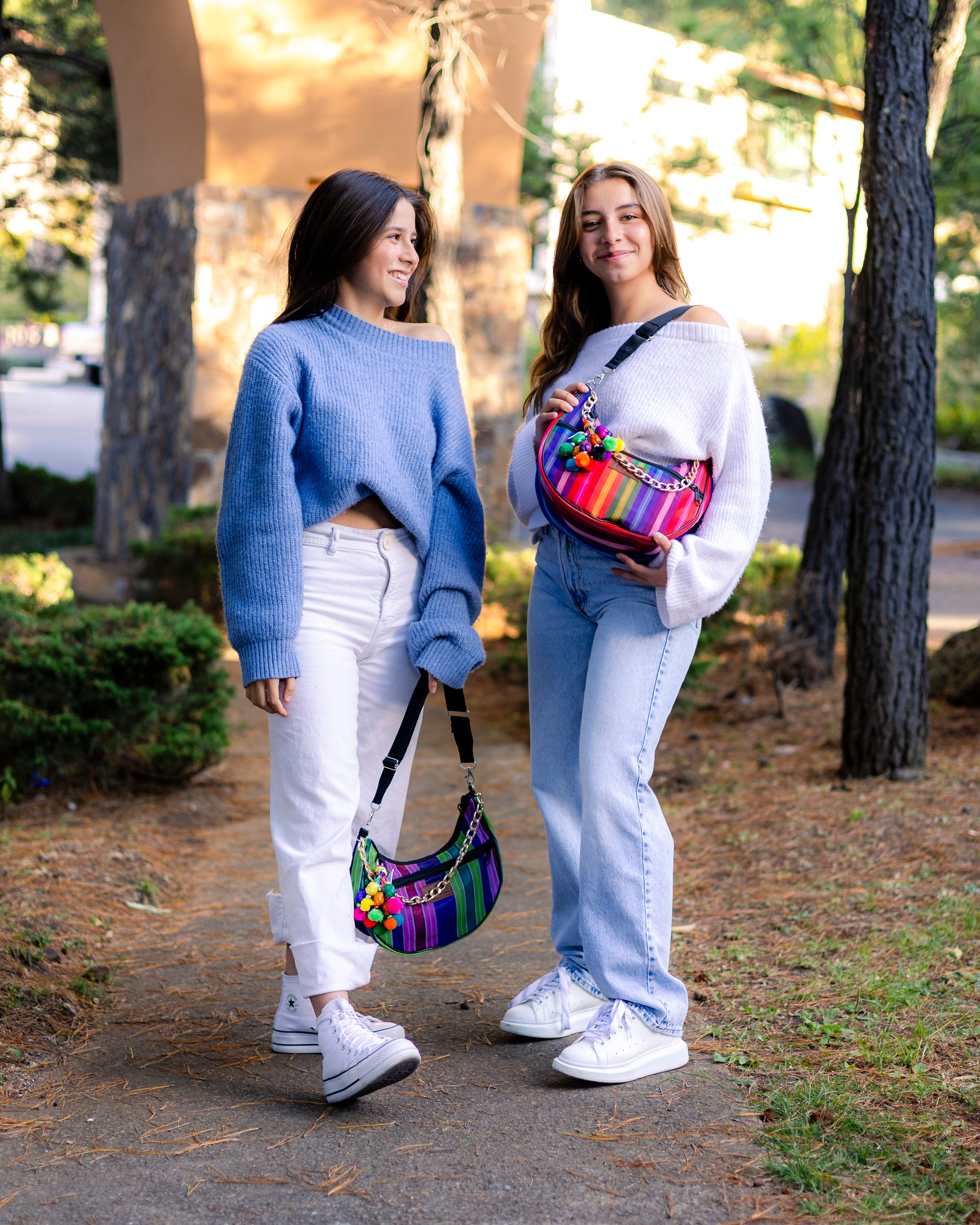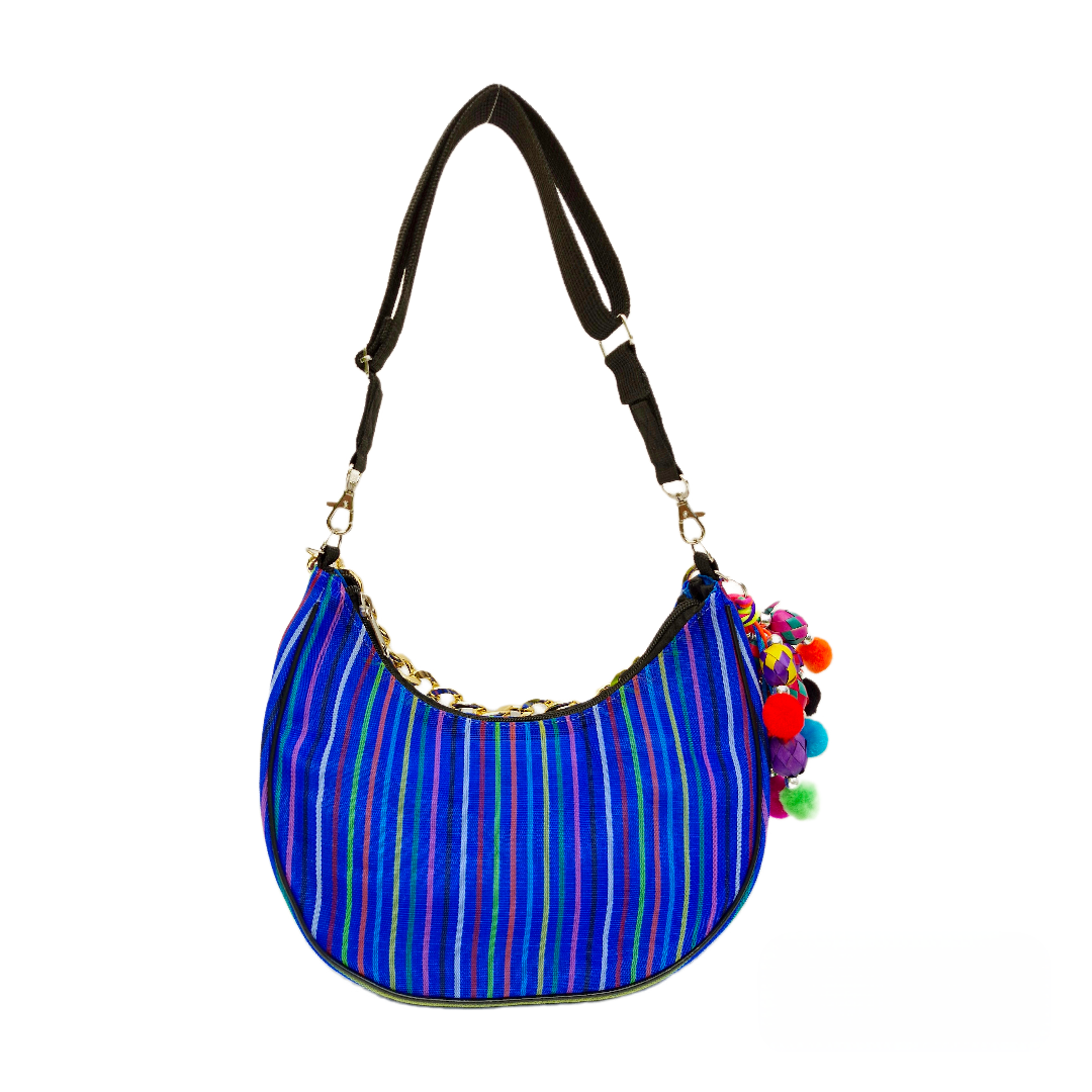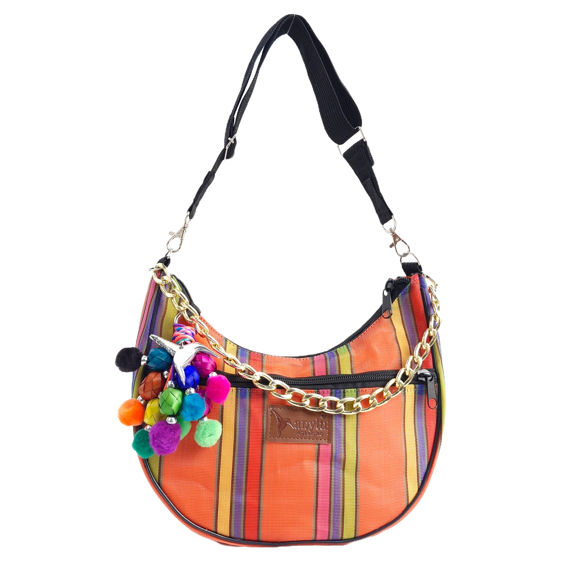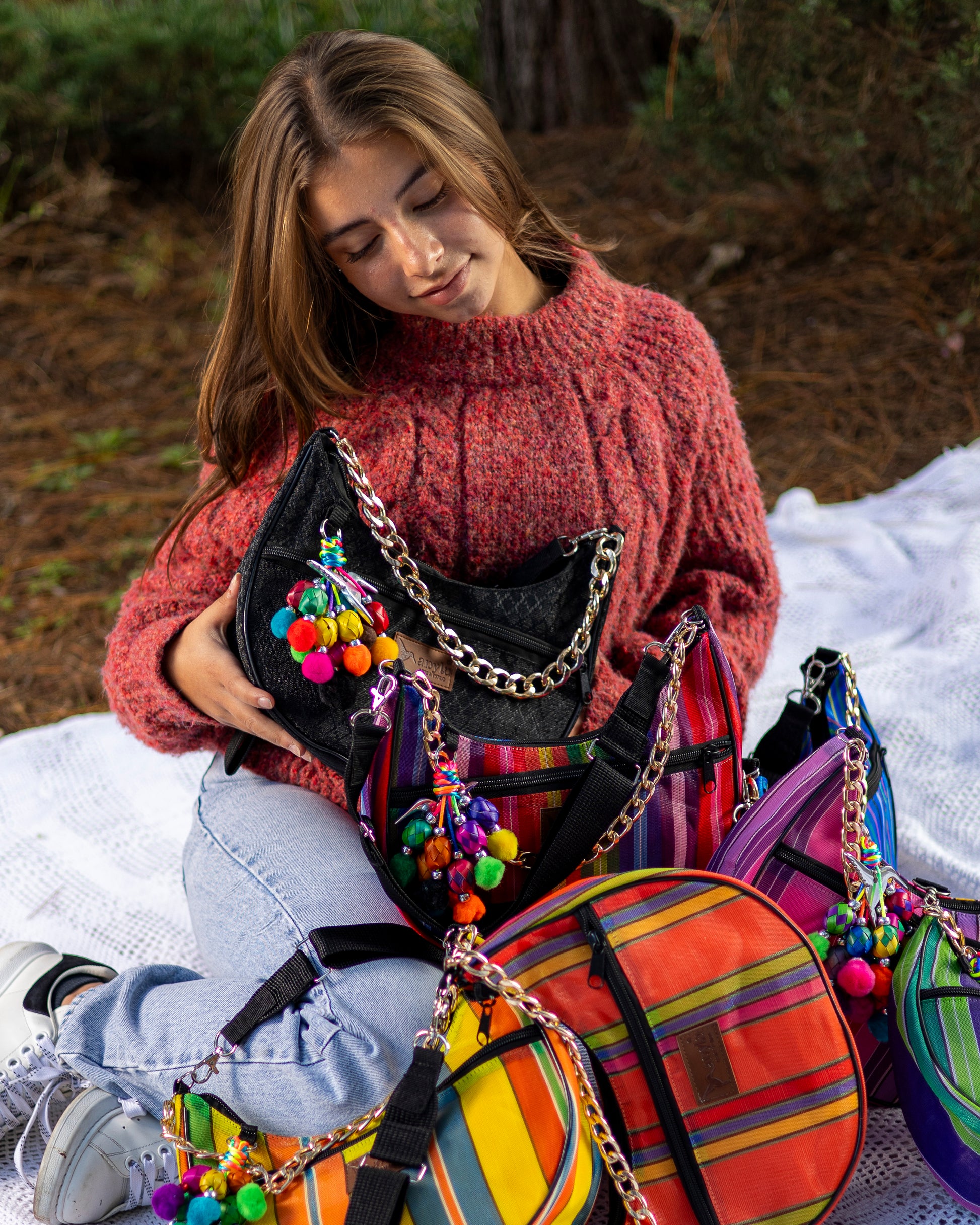Descubre el bolso Luna, una pieza única que combina elegancia y estilo en una forma de media luna innovadora. Con unas dimensiones perfectas de 28 cm de ancho y 22 cm de alto, este bolso ofrece un diseño sofisticado y práctico. Su cadena dorada le aporta un toque de glamour, mientras que el asa larga ajustable garantiza comodidad y versatilidad en cada uso. Además, el encantador llavero con esferas de palma de Tzintzuntzan añade un detalle artesanal y distintivo, que celebra la tradición y la belleza en cada pequeño detalle. Luna es la elección ideal para quien busca un accesorio que resalte por su diseño elegante y su autenticidad cultural.