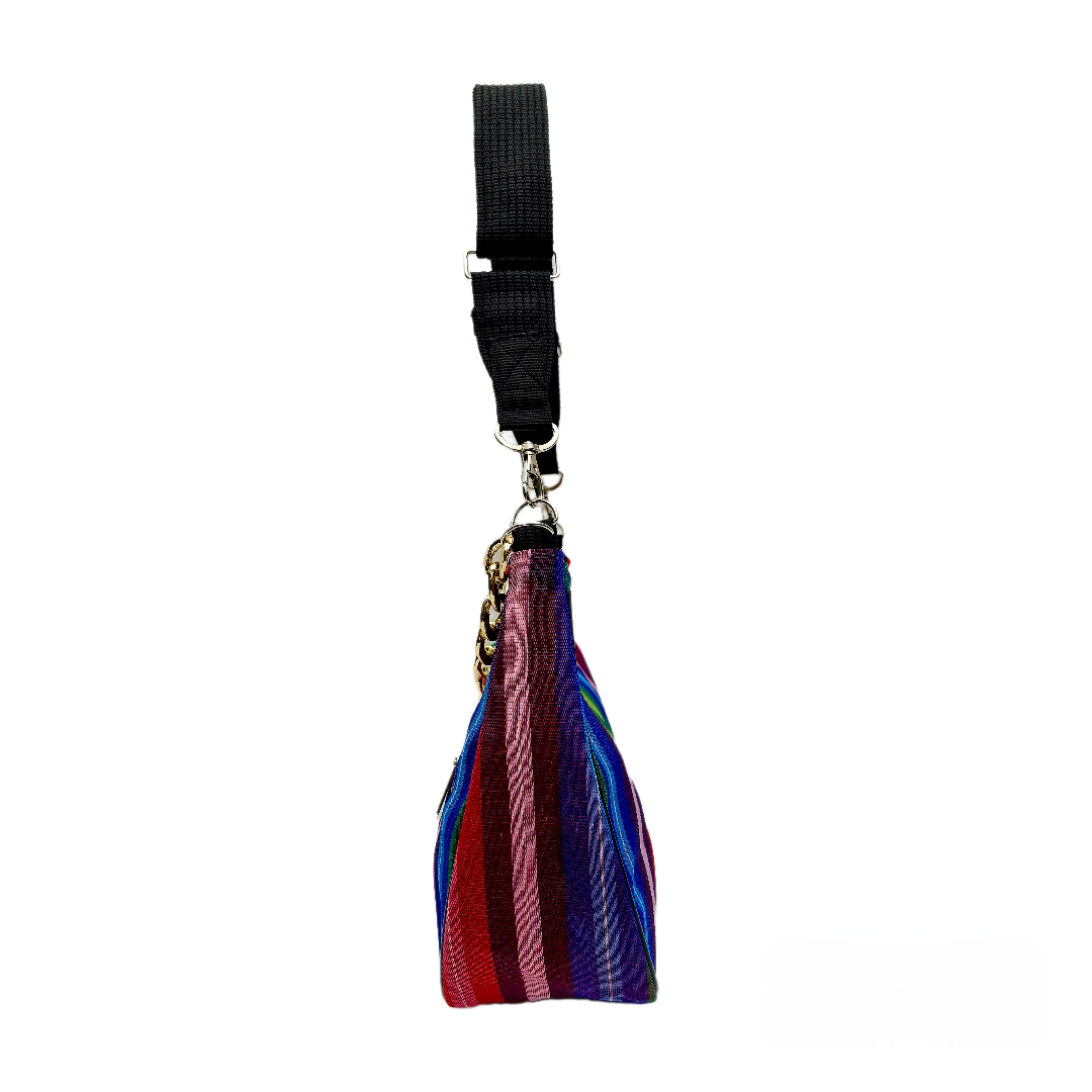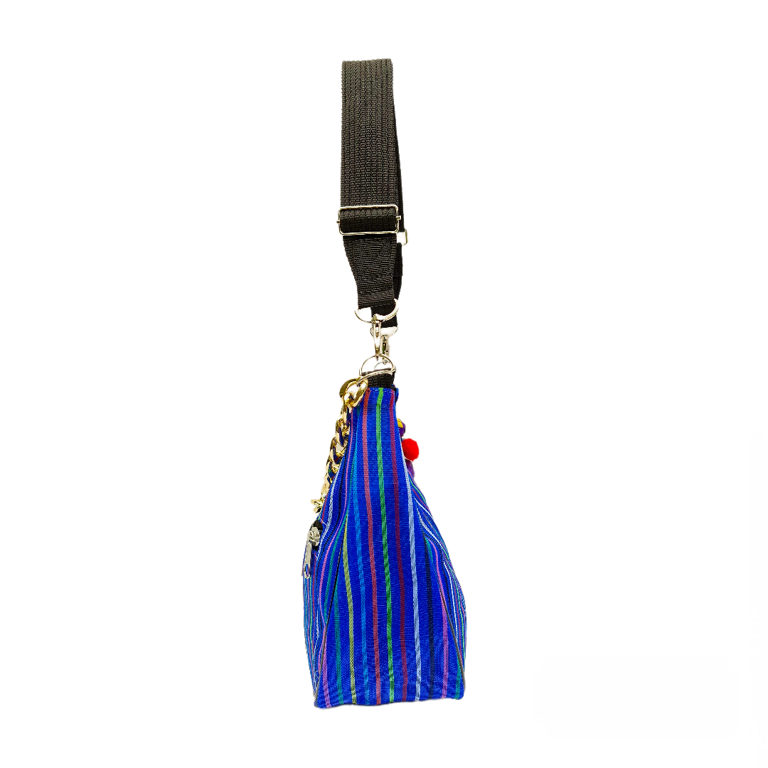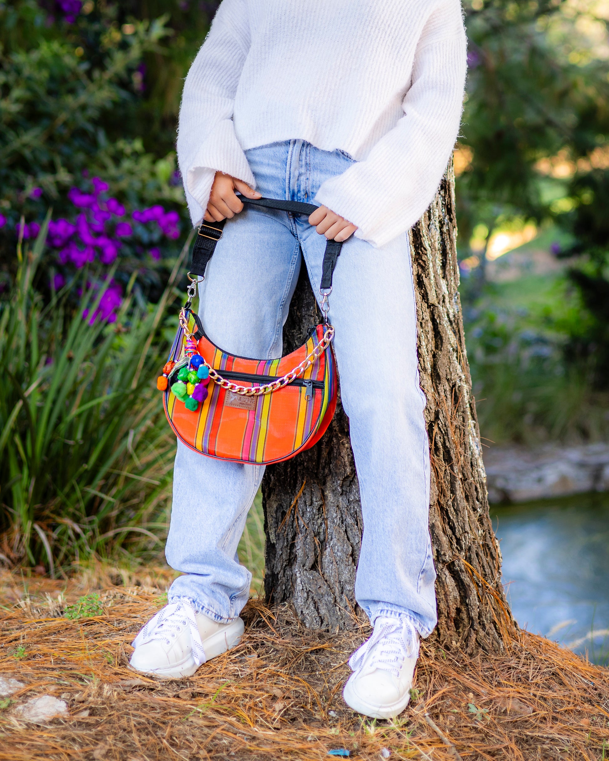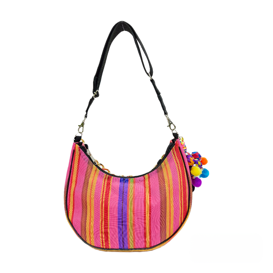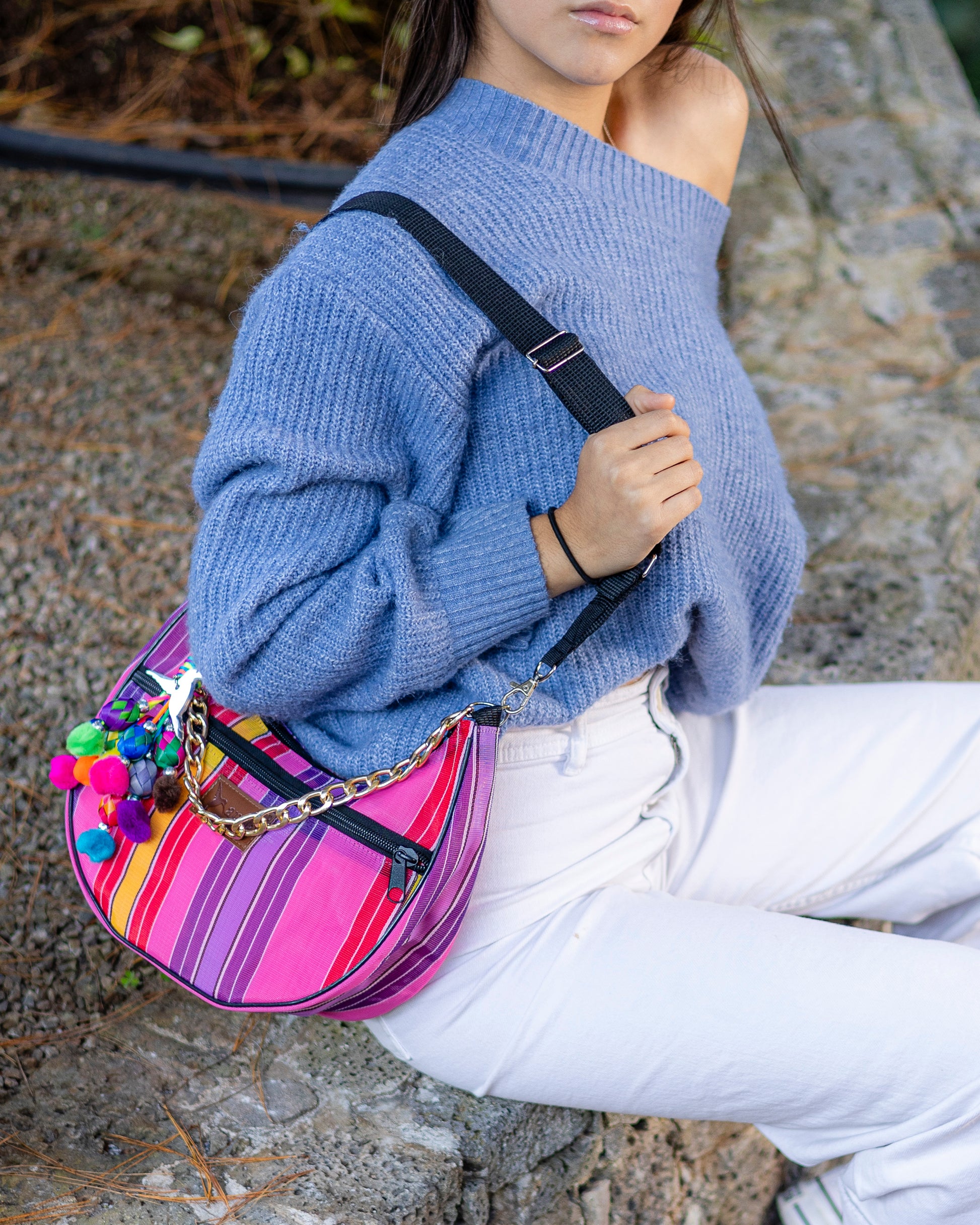 Descubre el bolso Luna, una pieza única que combina elegancia y estilo en una forma de media luna innovadora. Con unas dimensiones perfectas de 28 cm de ancho y 22 cm de alto, este bolso ofrece un diseño sofisticado y práctico. Su cadena dorada le aporta un toque de glamour, mientras que el asa larga ajustable garantiza comodidad y versatilidad en cada uso. Además, el encantador llavero con esferas de palma de Tzintzuntzan añade un detalle artesanal y distintivo, que celebra la tradición y la belleza en cada pequeño detalle. Luna es la elección ideal para quien busca un accesorio que resalte por su diseño elegante y su autenticidad cultural.