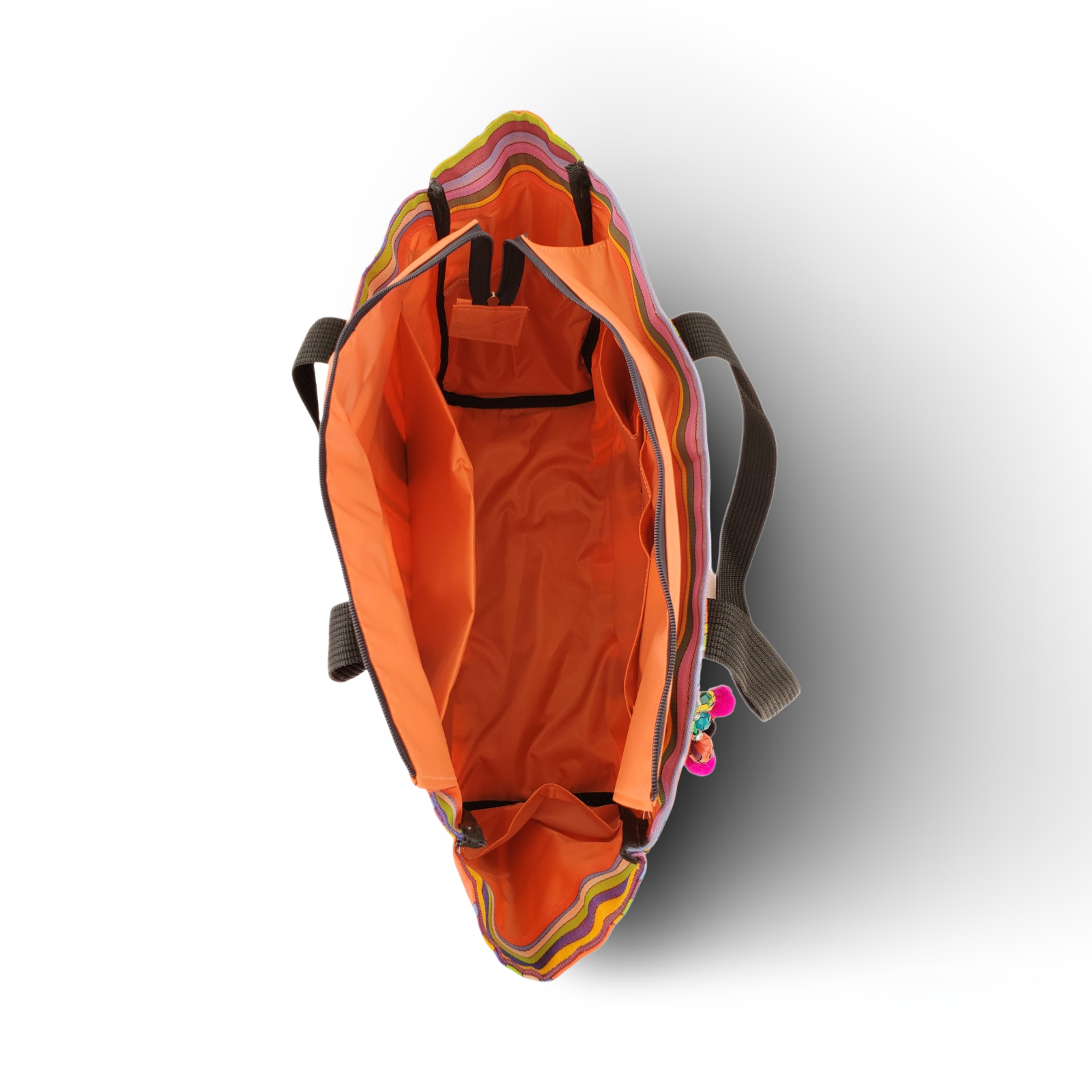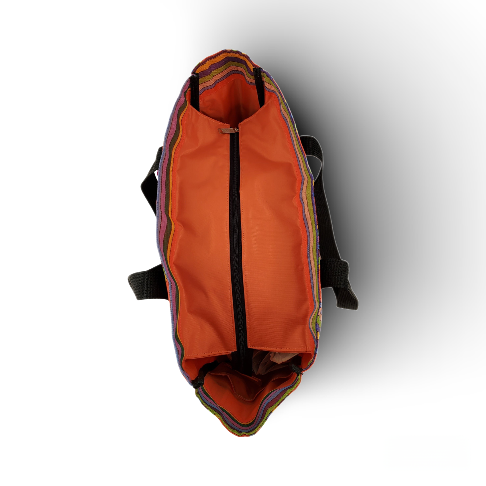 Tote bag, very resistant and durable to carry books, laptop and more, large and spacious. Interior compartments, with interior lining and closure. Easy to wash. With colibri keychain on the front.