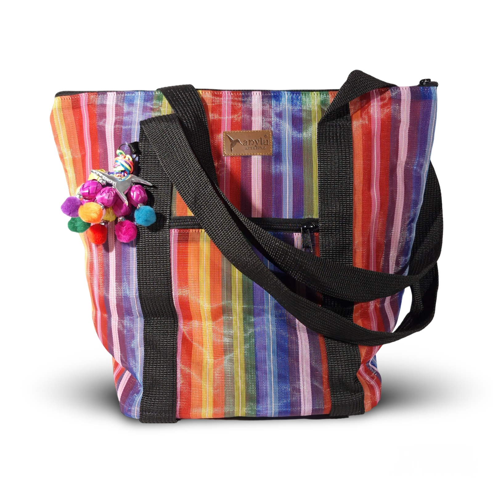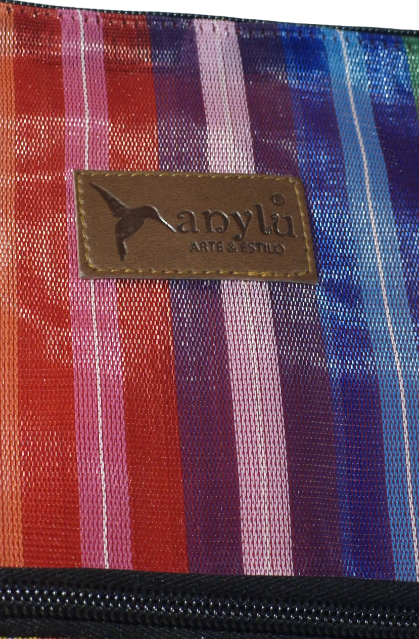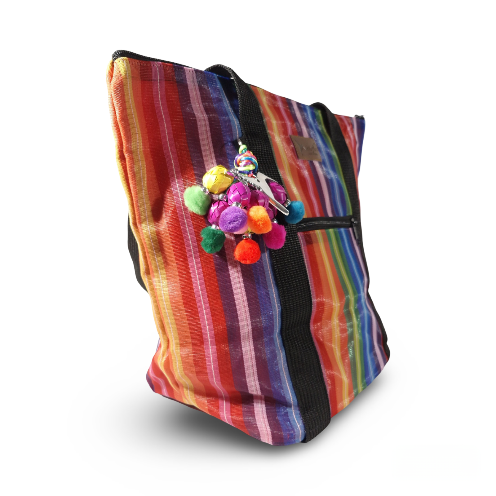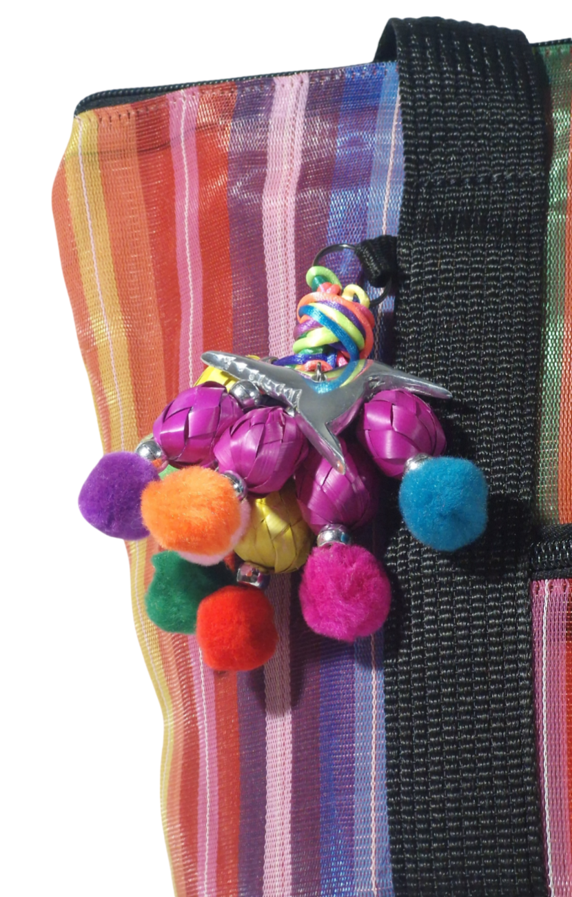 Inspirada en la colorida bolsa de ixtle usada por los aztecas, hemos diseñado cada uno de nuestros productos como una manifestación de nuestra mexicanidad. Elaborada artesanalmente con malla, porta nuestro distintivo llavero hecho con materiales típicos como el peltre de Tonalá, Jalisco y esferas de palma michoacanas.