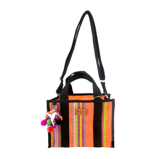 Inspirada en la colorida bolsa de ixtle usada por los aztecas, hemos diseñado cada uno de nuestros productos como una manifestación de nuestra mexicanidad. Elaborada artesanalmente con malla, porta nuestro distintivo llavero hecho con materiales típicos como el peltre de Tonalá, Jalisco y esferas de palma michoacanas.