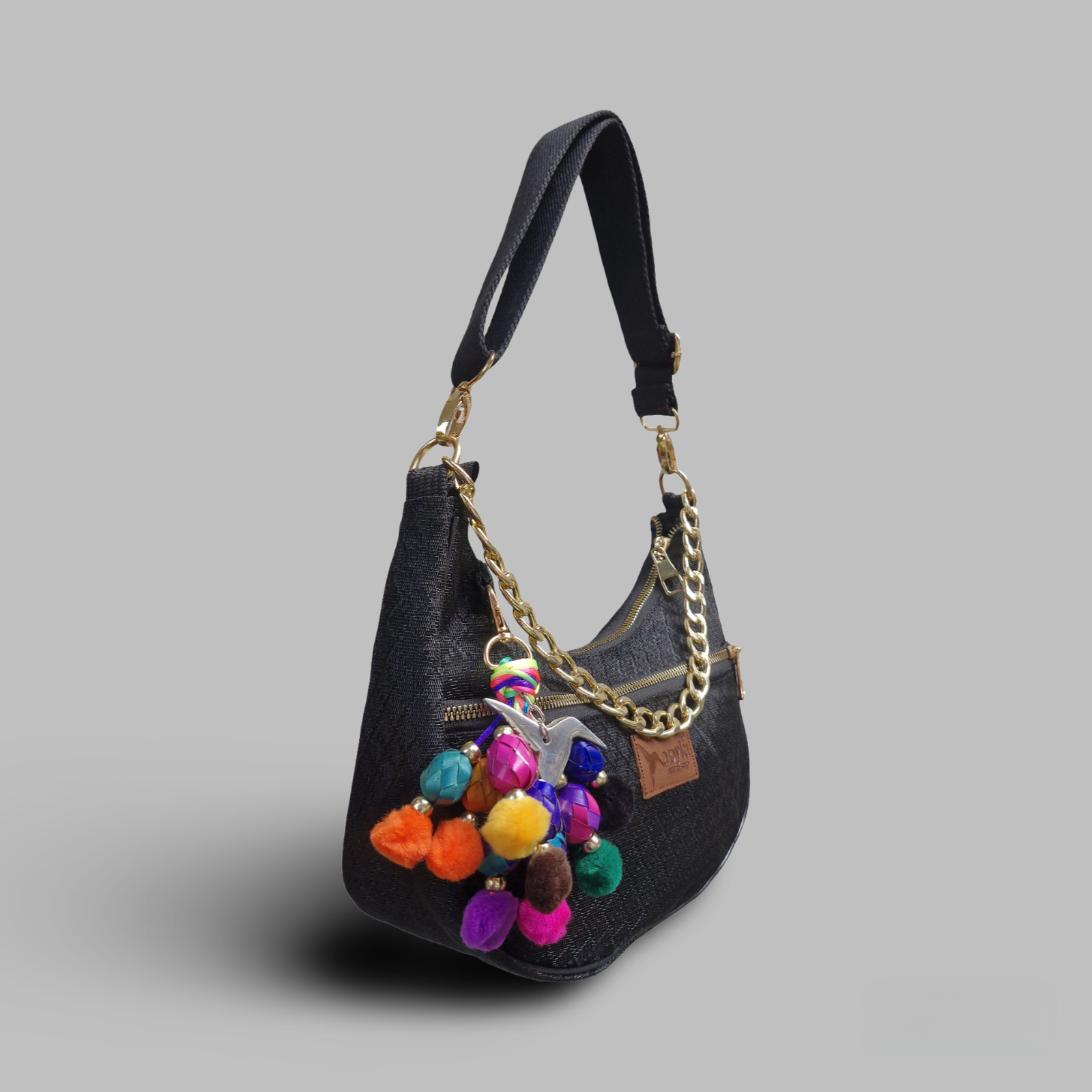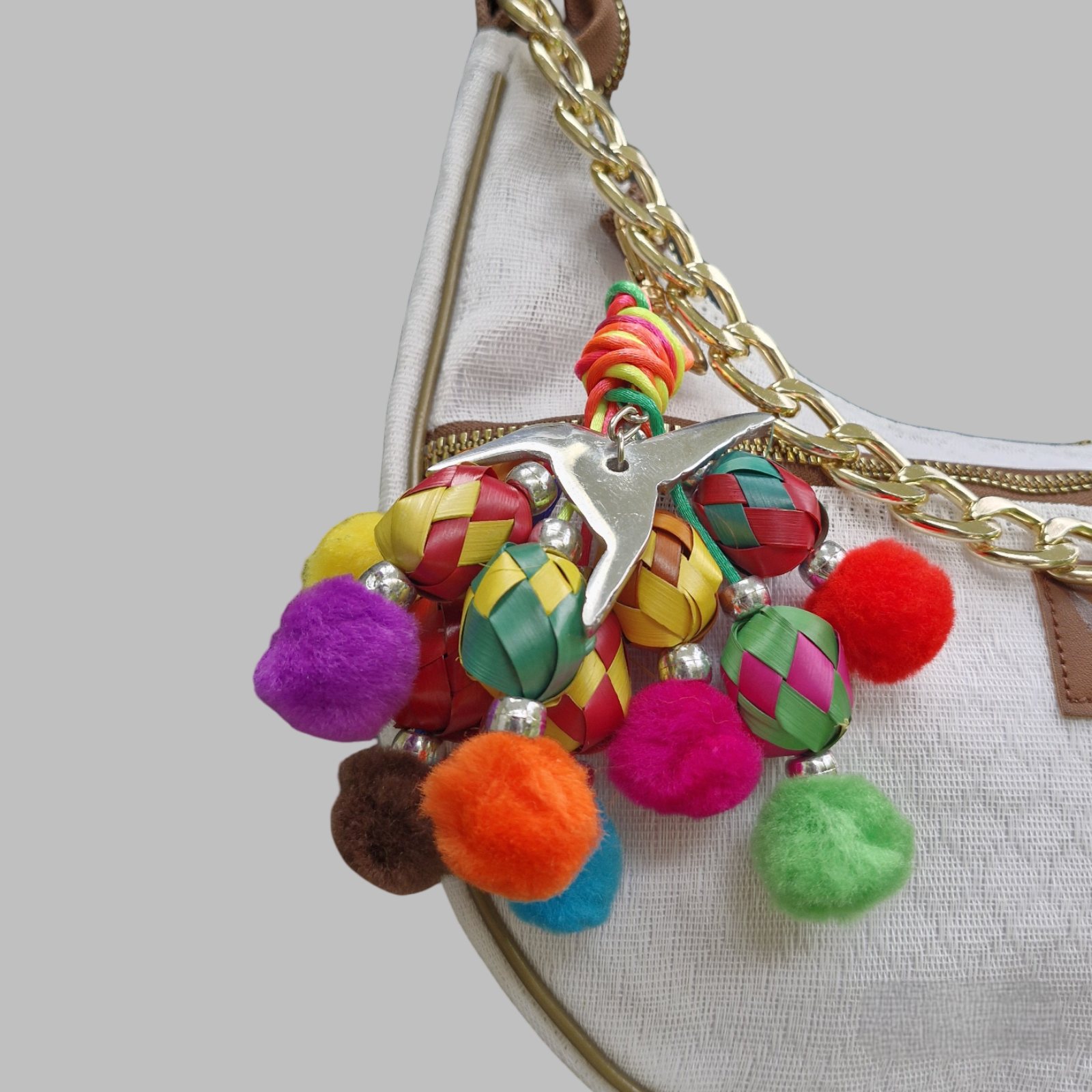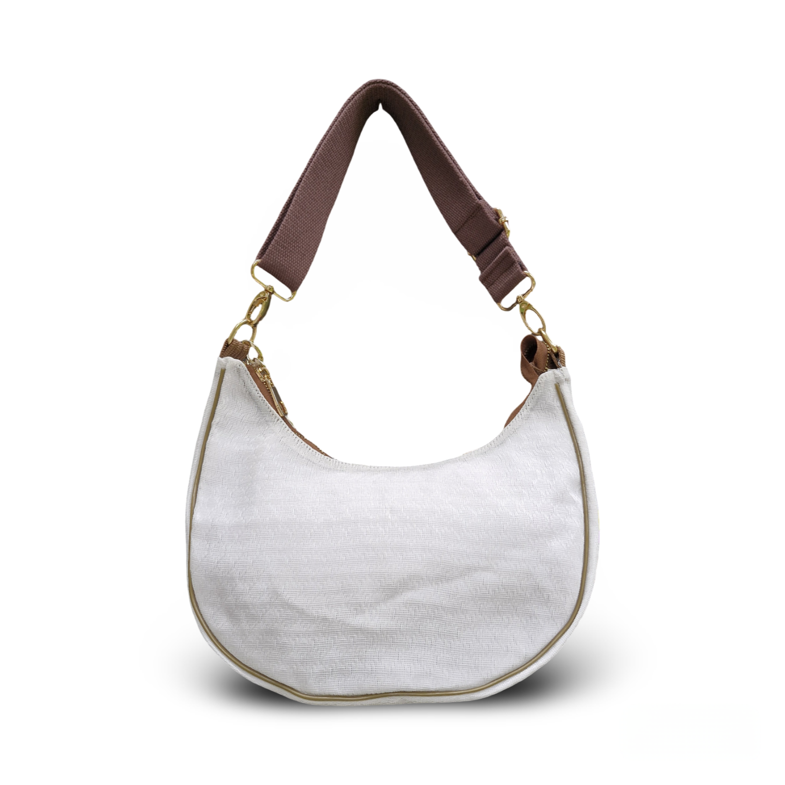 Descubre el bolso Luna, una pieza única que combina elegancia y estilo en una forma de media luna innovadora. Con unas dimensiones perfectas de 30 cm de ancho y 24 cm de alto, este bolso ofrece un diseño sofisticado y práctico. Su cadena dorada le aporta un toque de glamour, mientras que el asa larga ajustable garantiza comodidad y versatilidad en cada uso. Además, el encantador llavero con esferas de palma de Tzintzuntzan añade un detalle artesanal y distintivo, que celebra la tradición y la belleza en cada pequeño detalle. Luna es la elección ideal para quien busca un accesorio que resalte por su diseño elegante y su autenticidad cultural.