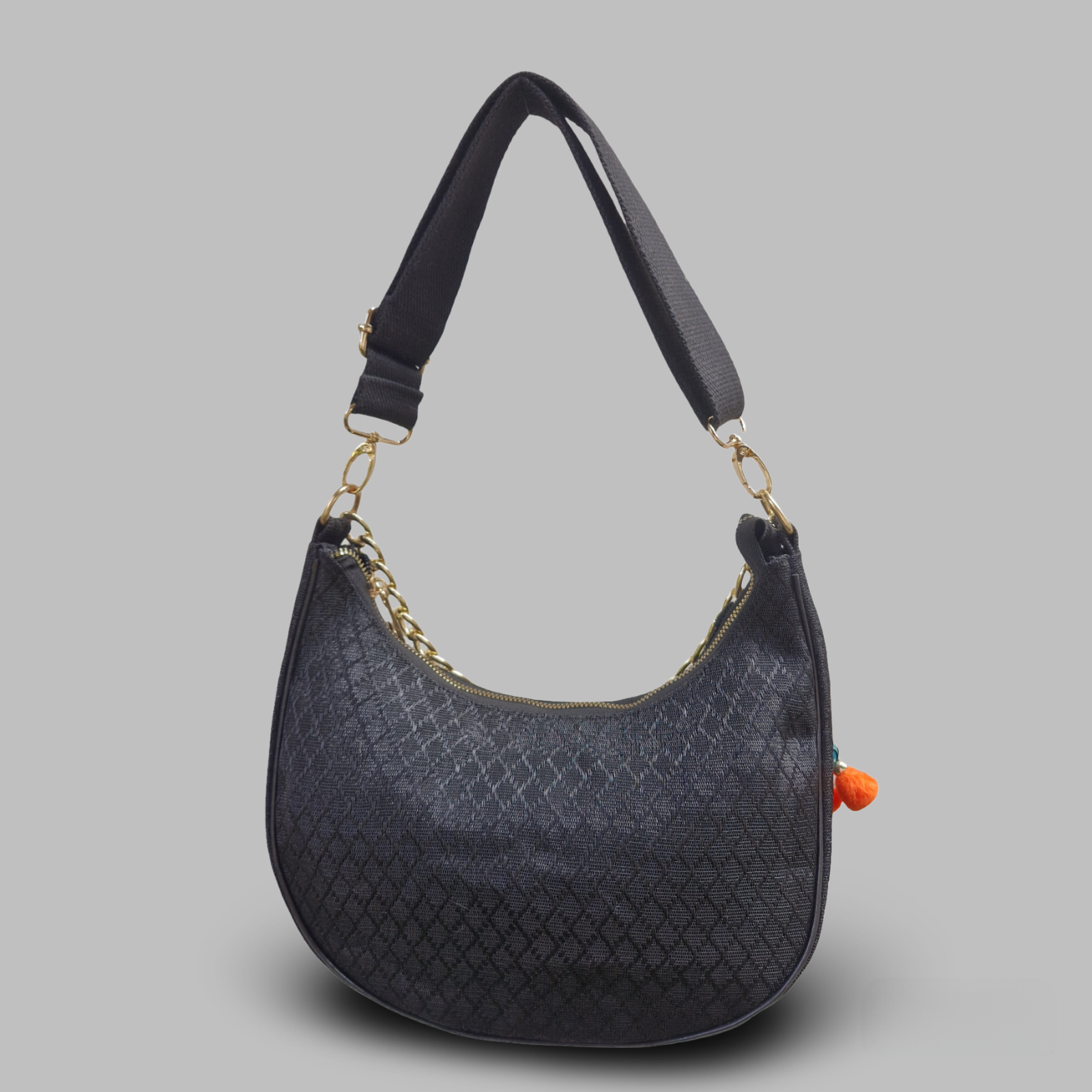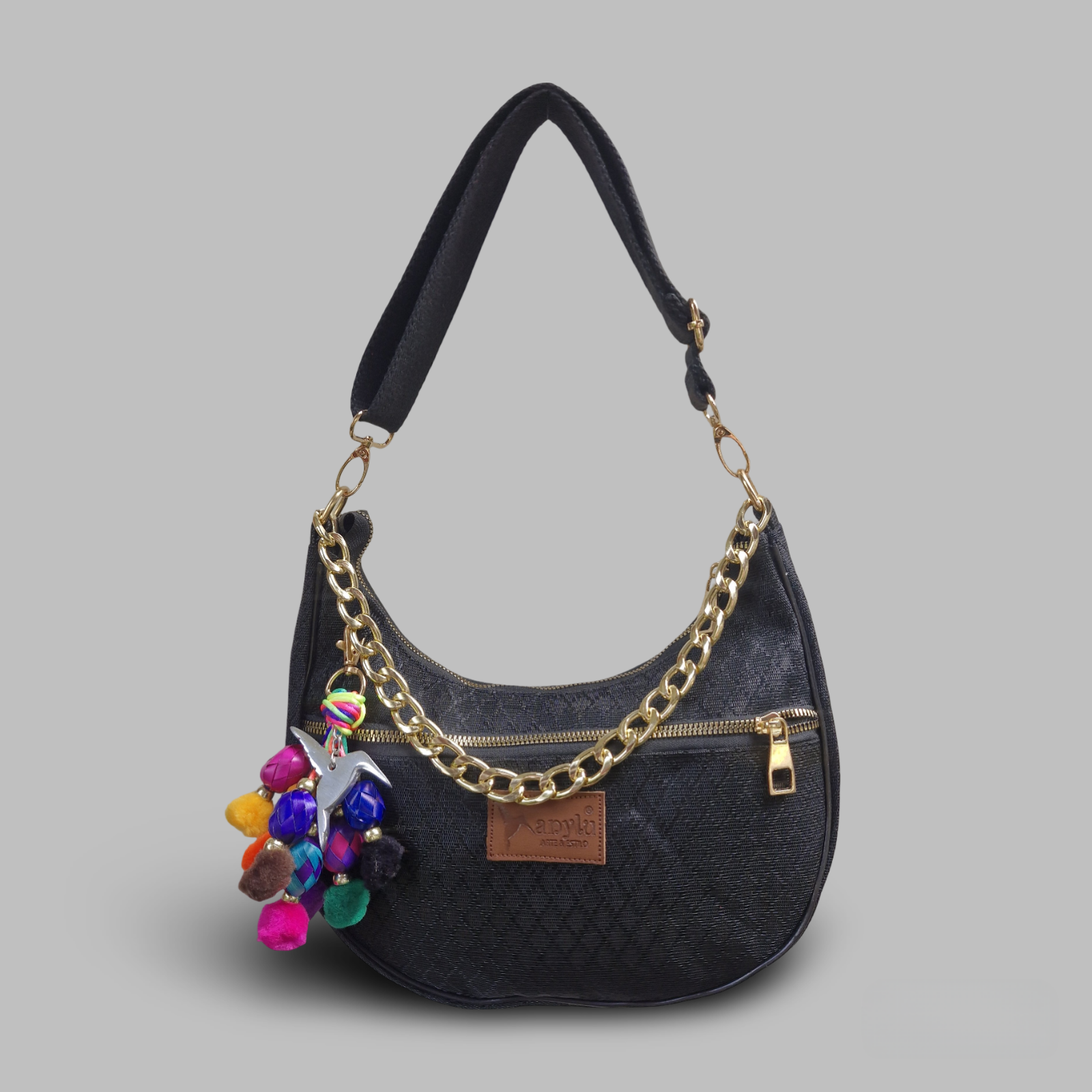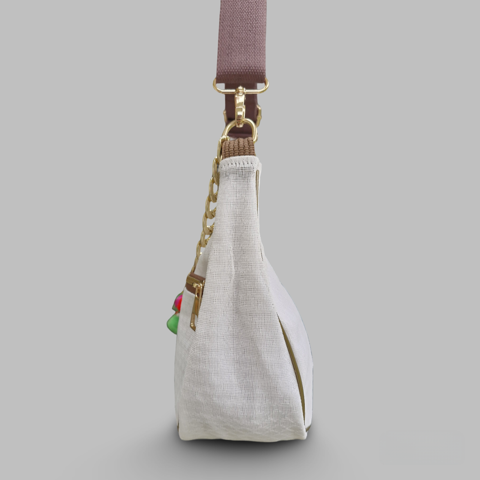 Descubre el bolso Luna, una pieza única que combina elegancia y estilo en una forma de media luna innovadora. Con unas dimensiones perfectas de 30 cm de ancho y 24 cm de alto, este bolso ofrece un diseño sofisticado y práctico. Su cadena dorada le aporta un toque de glamour, mientras que el asa larga ajustable garantiza comodidad y versatilidad en cada uso. Además, el encantador llavero con esferas de palma de Tzintzuntzan añade un detalle artesanal y distintivo, que celebra la tradición y la belleza en cada pequeño detalle. Luna es la elección ideal para quien busca un accesorio que resalte por su diseño elegante y su autenticidad cultural.